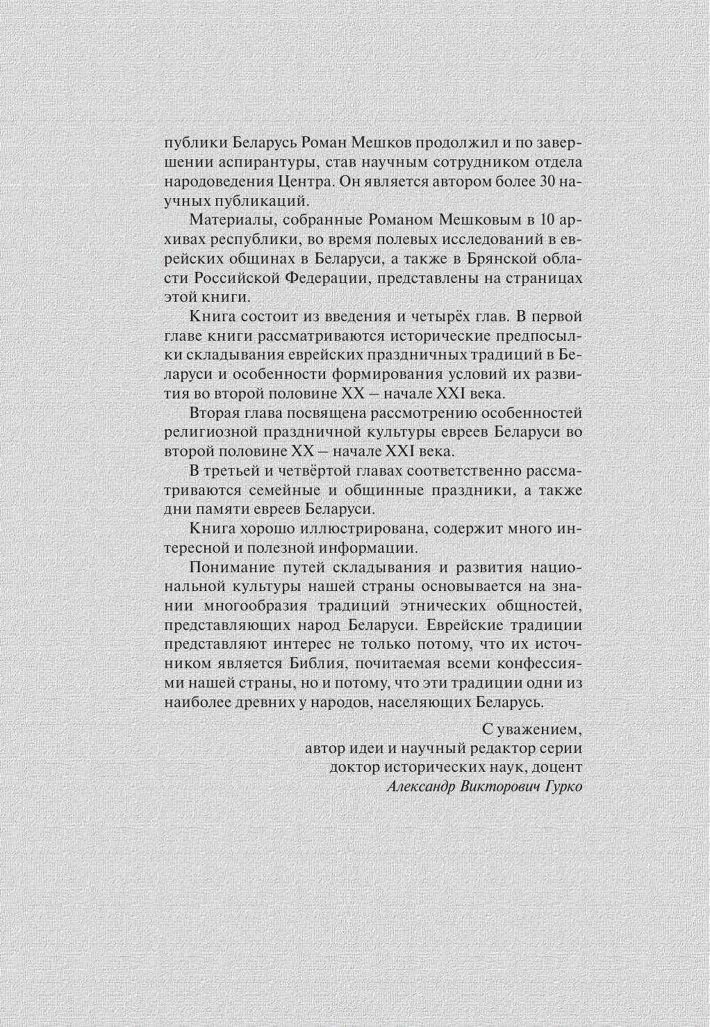В книге представлены особенности еврейских праздничных традиций в Беларуси во второй половине XX – начале XXI века, еврейские праздники и посты годового цикла, семейные и общественные традиции.