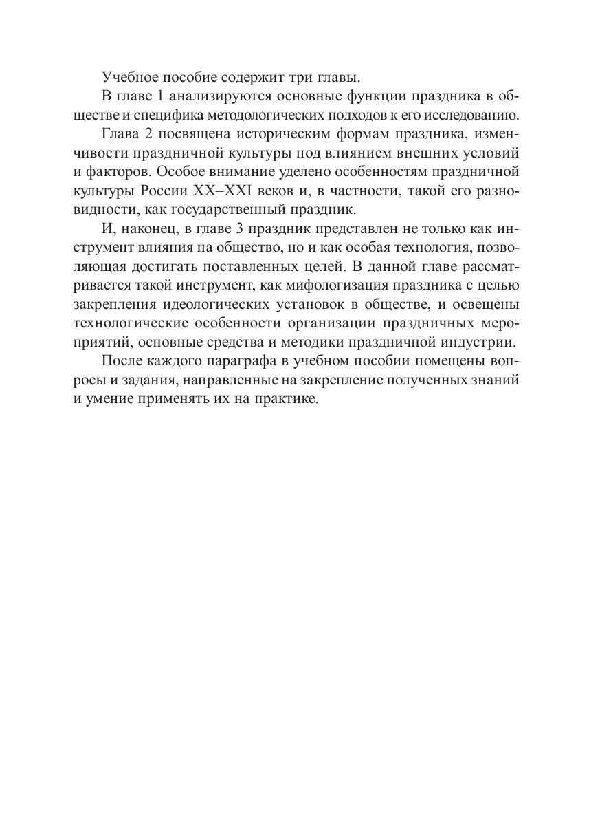 Учебное пособие содержит обобщенные материалы по теории и истории праздника как социокультурного феномена, отражающего ключевые изменения в обществе и раскрывающего свою специфику в рамках праздничной культуры. Особое внимание уделено эволюции праздничной культуры России, в частности государственному празднику как одному из типов праздничного действа. Автор также рассматривает основные методологические подходы к исследованию праздника и анализирует предпосылки его исторической трансформации.Для студентов, изучающих дисциплины «Праздник как социокультурный феномен», «Праздник в современной культуре».
