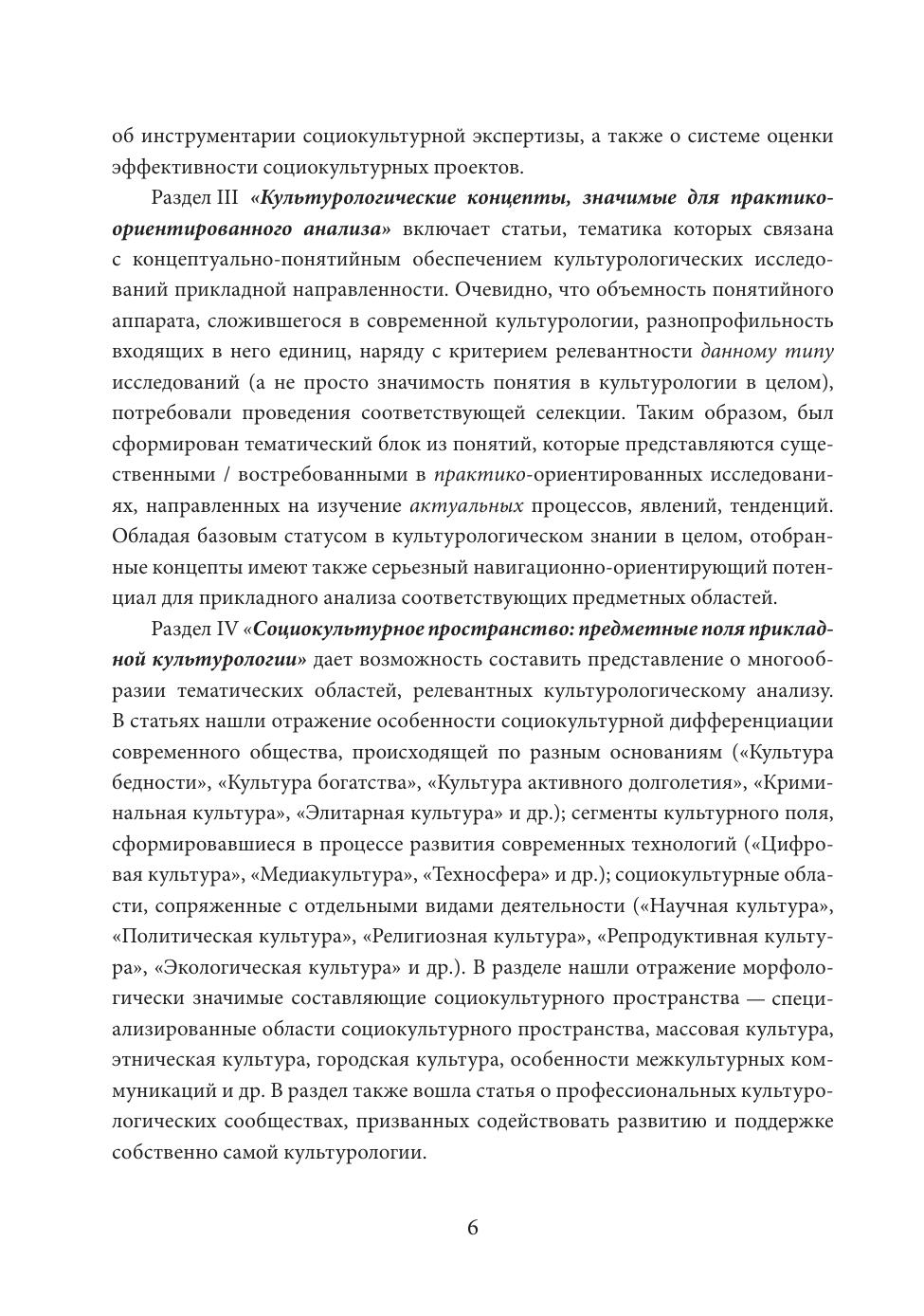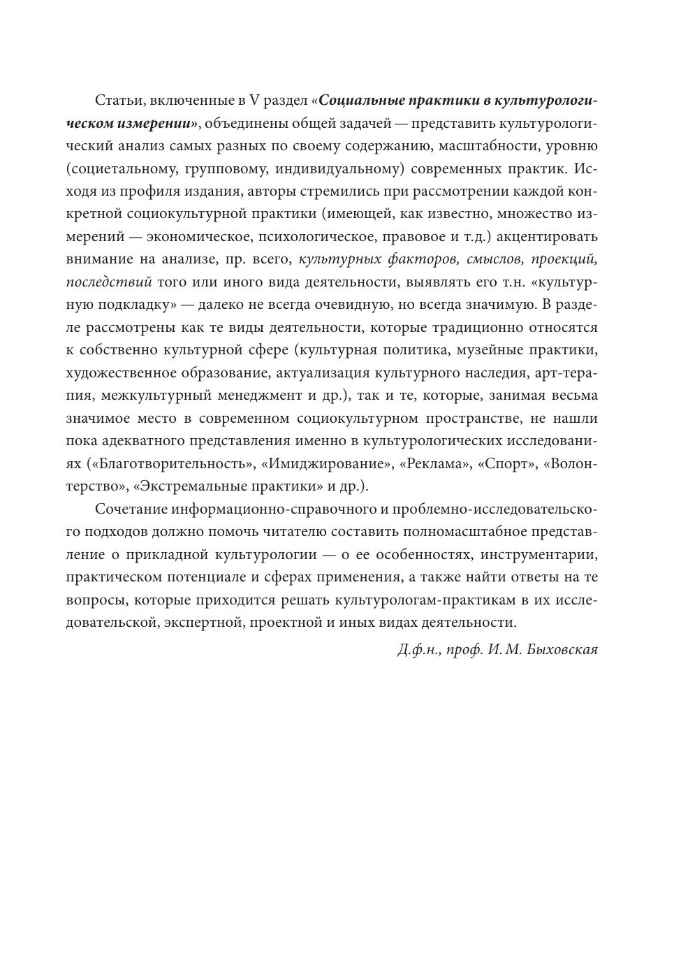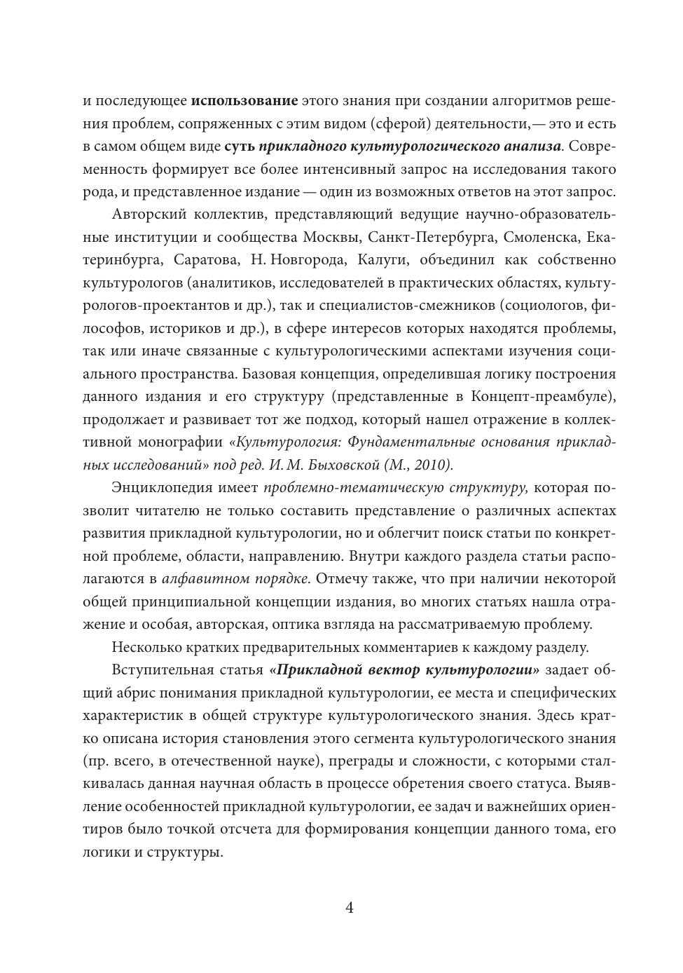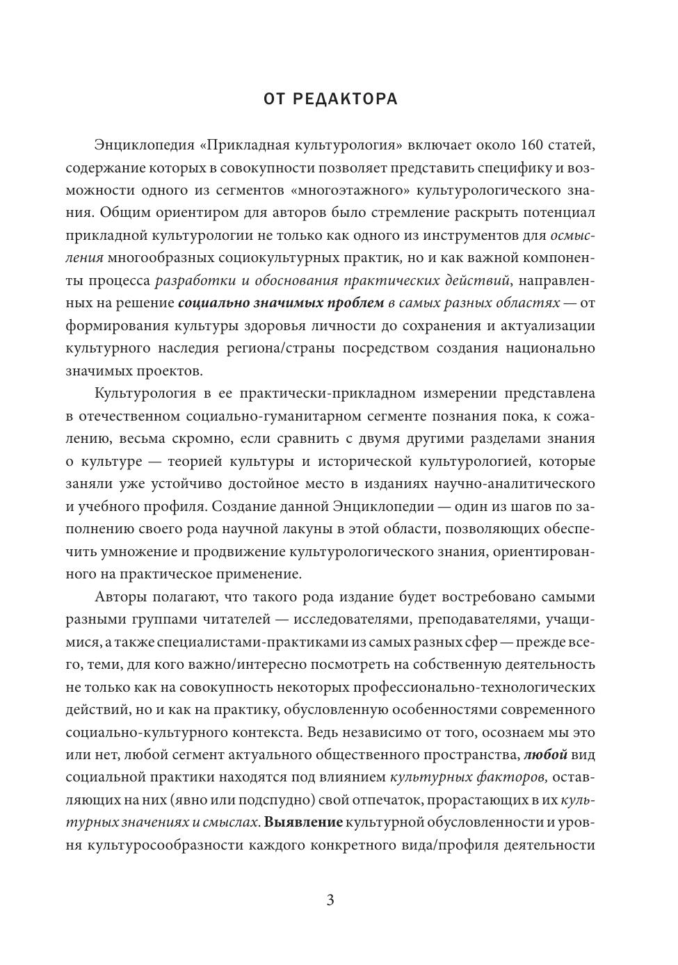 Энциклопедия включает более 150 статей, отражающих основные характеристики прикладной культурологии – одного из подразделов культурологии (наряду с теоретическим и историческим), ориентированного на изучение современных явлений и процессов для использования получаемого знания в практической деятельности – аналитической, проектной, экспертной и др. Статьи сгруппированы в 5-ти тематических разделах (с алфавитным принципом внутри каждого), посвященных особенностям и теоретико-методологическим основаниям прикладной культурологии; ее инструментарию; многообразию предметных областей изучения и социальных сфер применения. Кратко описан процесс становления отечественной прикладной культурологии. Издание, сочетающее информационно-справочный и проблемно-исследовательский подходы, предназначено как для системы образования, так и для практиков, заинтересованных в использовании культурологического знания в профессиональной деятельности.
