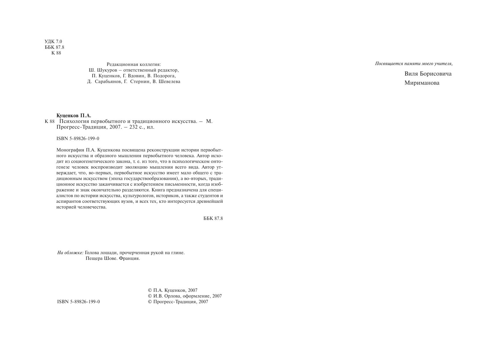 Монография П.А. Куценкова посвящена реконструкции истории первобытного искусства и образного мышления первобытного человека. Автор исходит из социогенетического закона, т. е. из того, что в психологическом онтогенезе человек воспроизводит эволюцию мышления всего вида. Автор утверждает, что, во-первых, первобытное искусство имеет мало общего с традиционным искусством (эпоха государствообразования), а во-вторых, традиционное искусство заканчивается с изобретением письменности, когда изображение и знак окончательно разделяются. Книга предназначена для специалистов по истории искусства, культурологов, историков, а также студентов и аспирантов соответствующих вузов, и всех тех, кто интересуется древнейшей историей человечества.