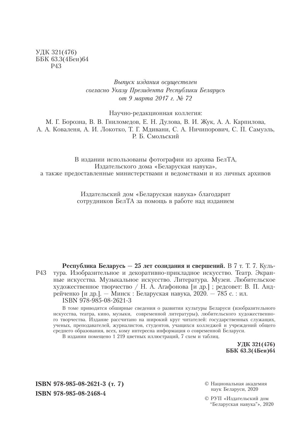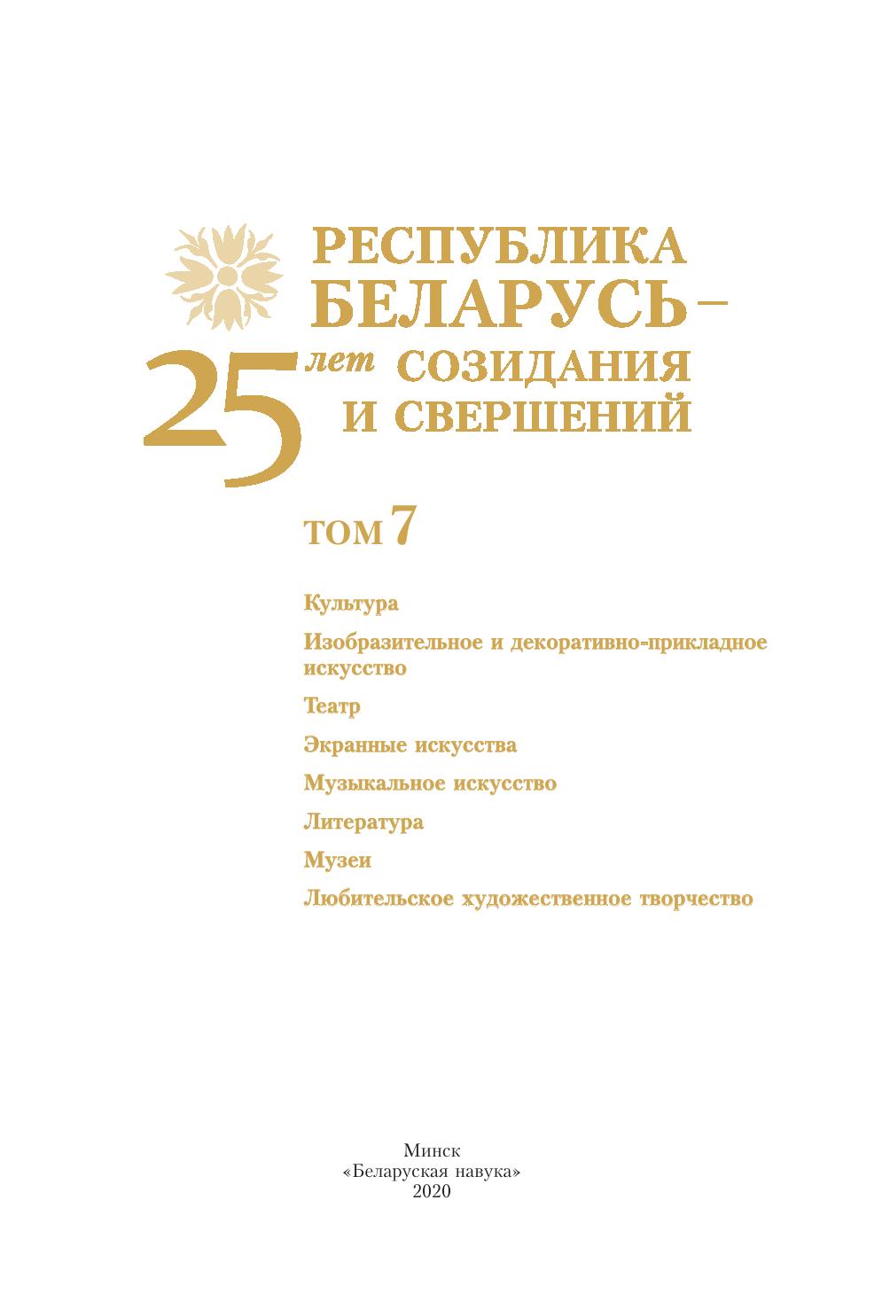 Республика Беларусь — 25 лет созидания и свершений. В 7 т. Т. 7. Культура. Изобразительное и декоративно-прикладное искусство. Театр. Экранные искусства. Музыкальное искусство. Литература. Музеи. Любительское художественное творчество