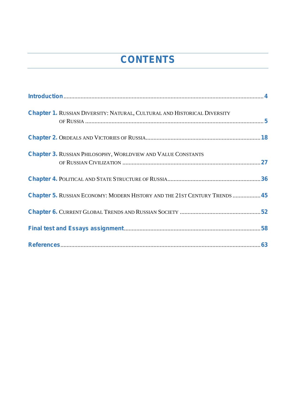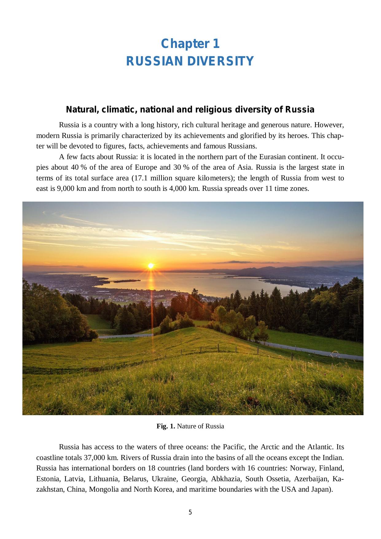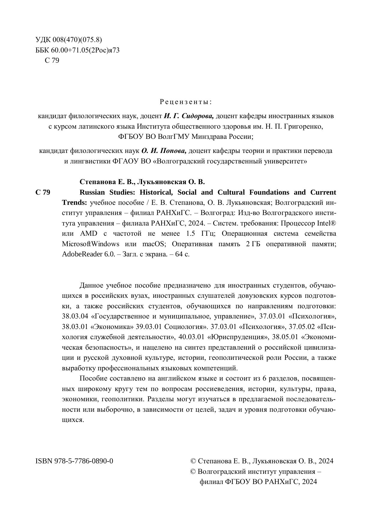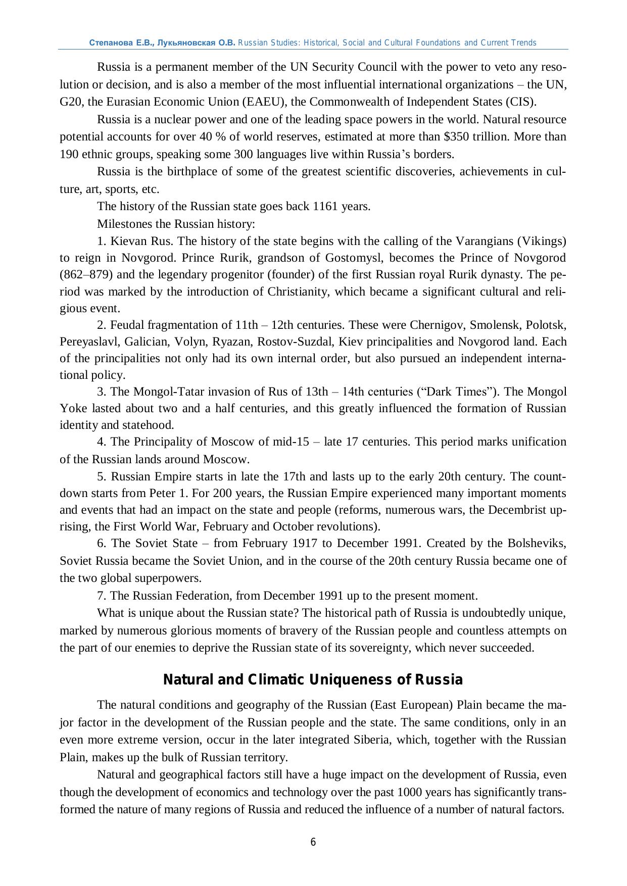Данное учебное пособие предназначено для иностранных студентов, обучаю-щихся в российских вузах, иностранных слушателей довузовских курсов подготов-ки, а также российских студентов, обучающихся по направлениям подготовки: 38.03.04 «Государственное и муниципальное, управление», 37.03.01 «Психология», 38.03.01 «Экономика» 39.03.01 Социология». 37.03.01 «Психология», 37.05.02 «Пси-хология служебной деятельности», 40.03.01 «Юриспруденция», 38.05.01 «Экономи-ческая безопасность», и нацелено на синтез представлений о российской цивилиза-ции и русской духовной культуре, истории, геополитической роли России, а также выработку профессиональных языковых компетенций. Пособие составлено на английском языке и состоит из 6 разделов, посвящен-ных широкому кругу тем по вопросам россиеведения, истории, культуры, права, экономики, геополитики. Разделы могут изучаться в предлагаемой последователь-ности или выборочно, в зависимости от целей, задач и уровня подготовки обучаю-щихся.