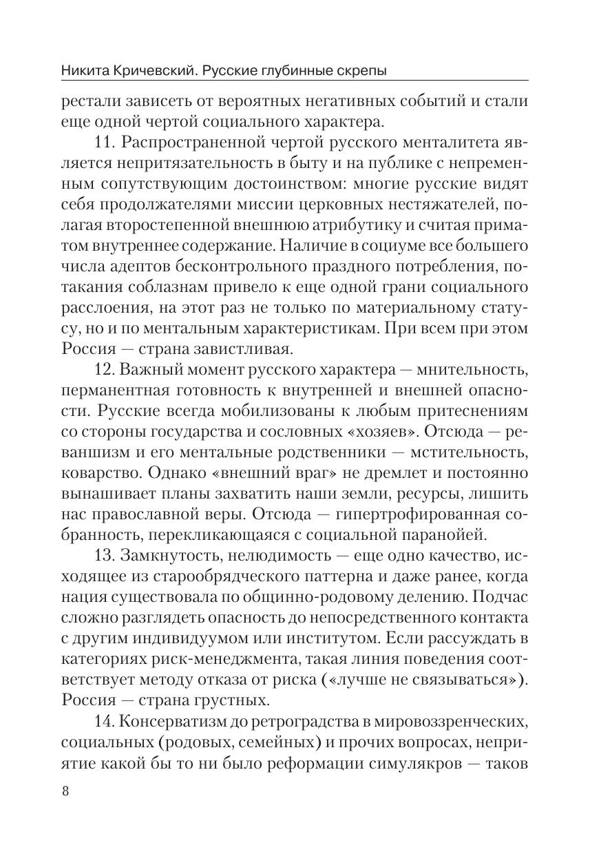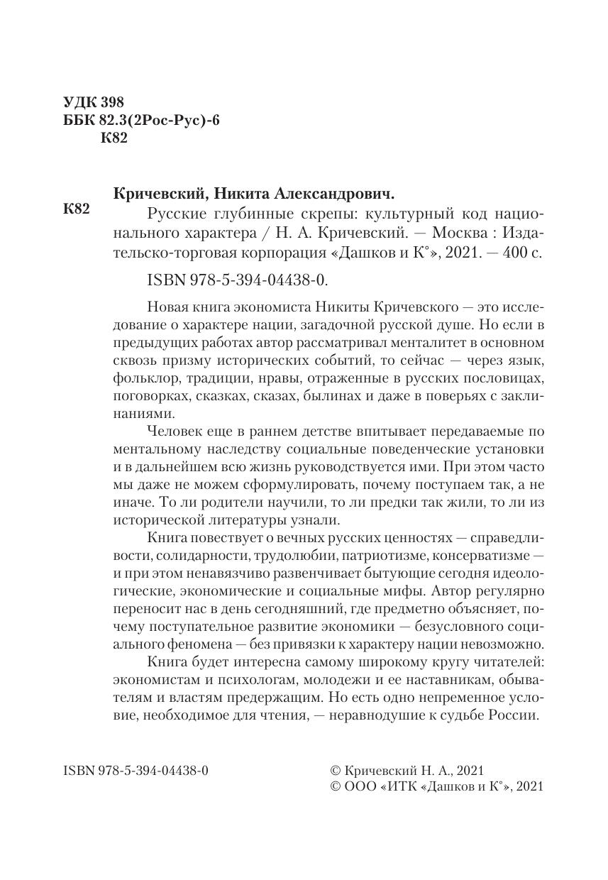 Новая книга экономиста Никиты Кричевского — это исследование о характере нации, загадочной русской душе. Но если в предыдущих работах автор рассматривал менталитет в основном сквозь призму исторических событий, то сейчас — через язык, фольклор, традиции, нравы, отраженные в русских пословицах, поговорках, сказках, сказах, былинах и даже в поверьях с заклинаниями.