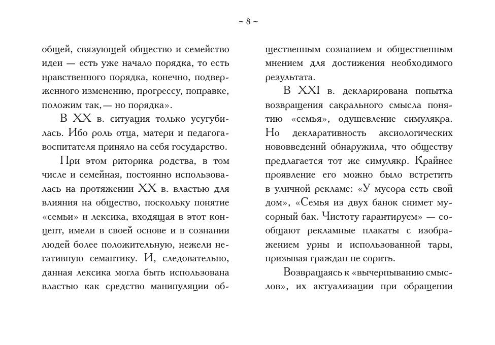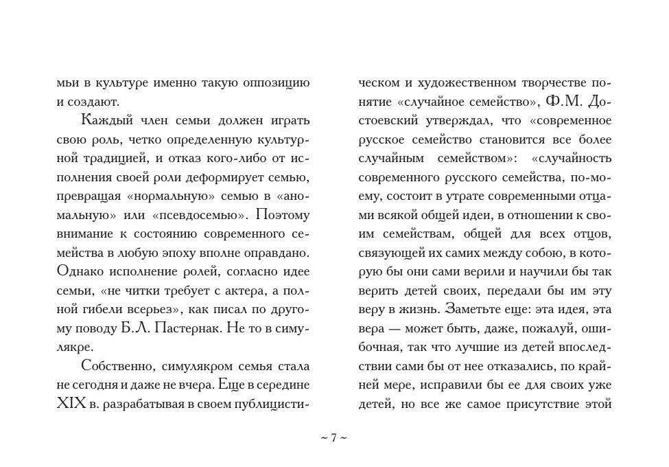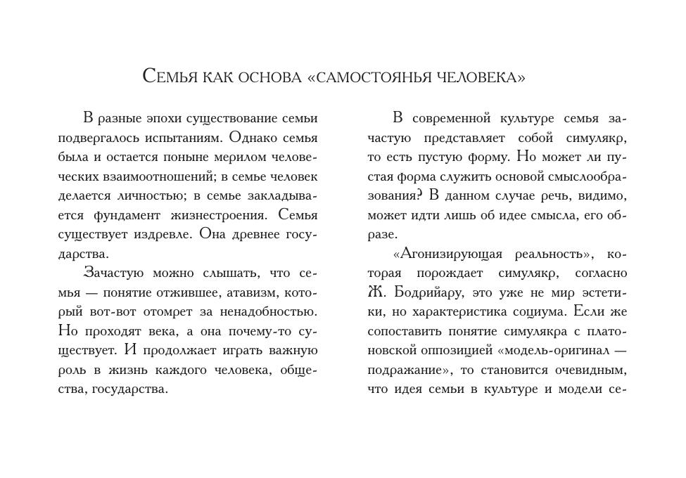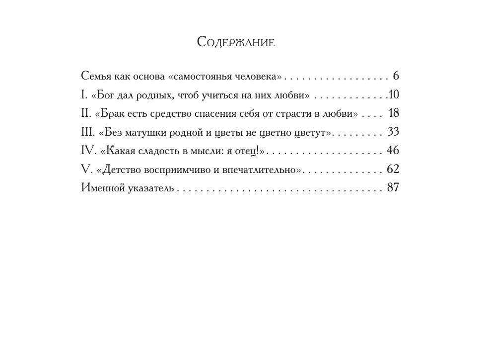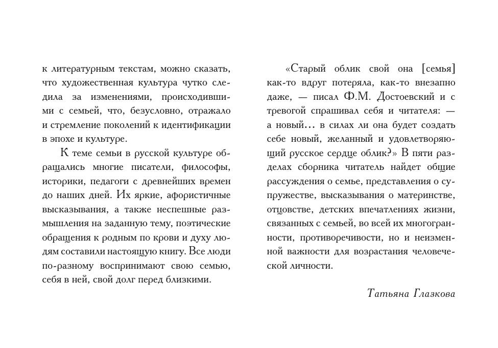 В книгу вошли фрагменты художественных, научных, публицистических произведений, эпистолярия и мемуаров русских писателей, философов, педагогов о семье, древнейшей человеческой общности, играющей смыслообразующую роль в истории культуры отдельного человека и целого государства.