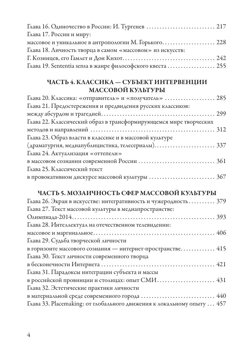 Книга искусствоведа и культуролога Татьяны Злотниковой обобщает многолетние исследования проблемы, которая одним кажется очевидной и значимой, у других вызывает сомнения в самом праве на научное исследование. Автор предлагает полемический и разносторонний подход к проблеме массового сознания как сложнейшего философского, психологического, социокультурного и культурологического феномена. Актуальный и подчас спекулятивно применяемый сегодня междисциплинарный дискурс выводит авторскую концепцию на изучение множества художественных явлений, включая русскую классику. Особое внимание уделено ситуации, более того — системе противостояния творца, интеллектуала, уникальной творческой личности тенденциям массовой культуры. Редкая особенность книги — присутствие в ней материалов эмпирических исследований (опросов, интервьюирования), что превращает теоретические рассуждения о массовой культуре в реальный механизм ее исследования. Наконец, важный для автора аспект: внимание именно к российскому опыту, для которого позиция отторжения массовой культуры столь же знаменательна, как и позиция восприятия ее соблазнов. По сути, автор предлагает ответ на вопрос-парадокс: «есть ли жизнь в сфере массовой культуры?».