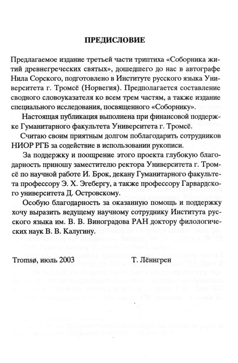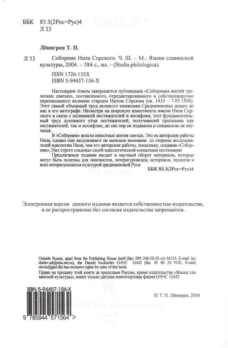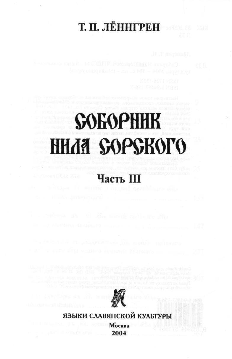 Настоящим томом завершается публикация «Соборника житий греческих святых», составленного, отредактированного и собственноручно переписанного великим старцем Нилом Сорским (ок. 1433 — 7.05.1508). Этот самый объемный труд великого книжника Средневековья дошел до нас в его автографе. Несмотря на широкую известность имени Нила Сорского в связи с полемикой нестяжателей и иосифлян, этот фундаментальный труд духовного отца нестяжателей, получивший признание как нестяжателей, так и иосифлян, до сих пор не издавался и специально не изучался. В «Соборник» вошли известные жития святых. Это не авторские работы Нила, однако они заслуживают не меньшее внимание со стороны исследователей идеологии Нила, чем его авторские работы, поскольку, создавая «Соборник», Нил строго следовал своей идеологической концепции нестяжания. Предлагаемое издание вводит в научный оборот материалы, которые могут быть полезны для лингвистов, литературоведов, историков, теологов и всех интересующихся культурой средневековой Руси.