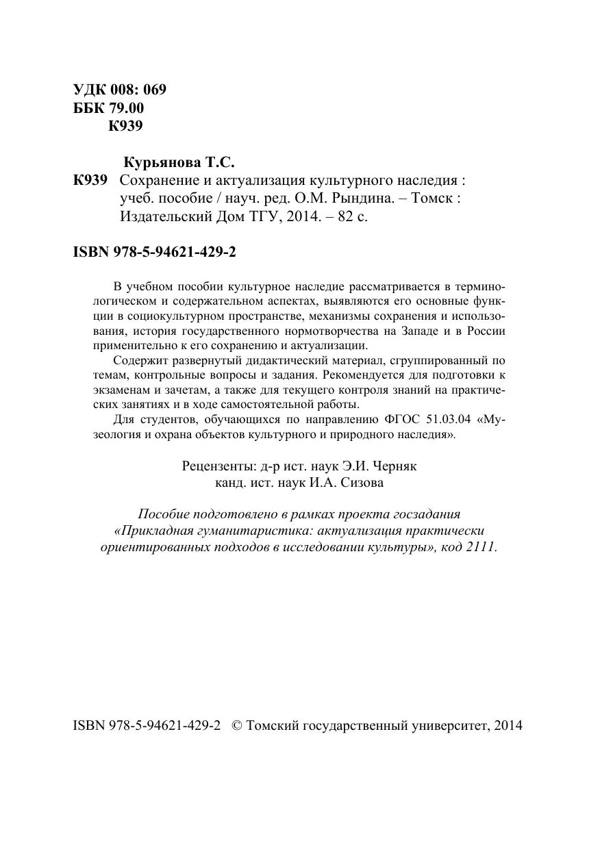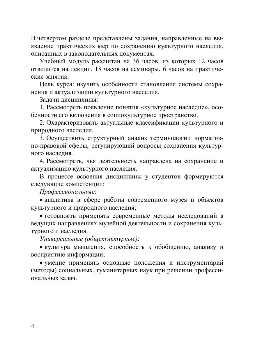 В учебном пособии культурное наследие рассматривается в терминологическом и содержательном аспектах, выявляются его основные функции в социокультурном пространстве, механизмы сохранения и использования, история государственного нормотворчества на Западе и в России применительно к его сохранению и актуализации. Содержит развернутый дидактический материал, сгруппированный по темам, контрольные вопросы и задания. Рекомендуется для подготовки к экзаменам и зачетам, а также для текущего контроля знаний на практических занятиях и в ходе самостоятельной работы. Для студентов, обучающихся по направлению ФГОС 51.03.04 «Музеология и охрана объектов культурного и природного наследия».