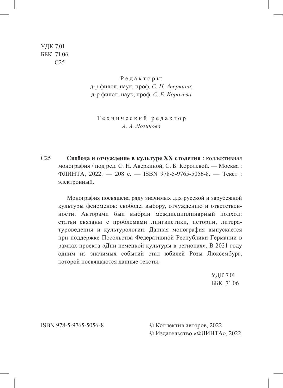 Монография посвящена ряду значимых для русской и зарубежной культуры феноменов: свободе, выбору, отчуждению и ответственности. Авторами был выбран междисциплинарный подход: статьи связаны с проблемами лингвистики, истории, литературоведения и культурологии. Данная монография выпускается при поддержке Посольства Федеративной Республики Германии в рамках проекта «Дни немецкой культуры в регионах». В 2021 году одним из значимых событий стал юбилей Розы Люксембург, которой посвящаются данные тексты.
