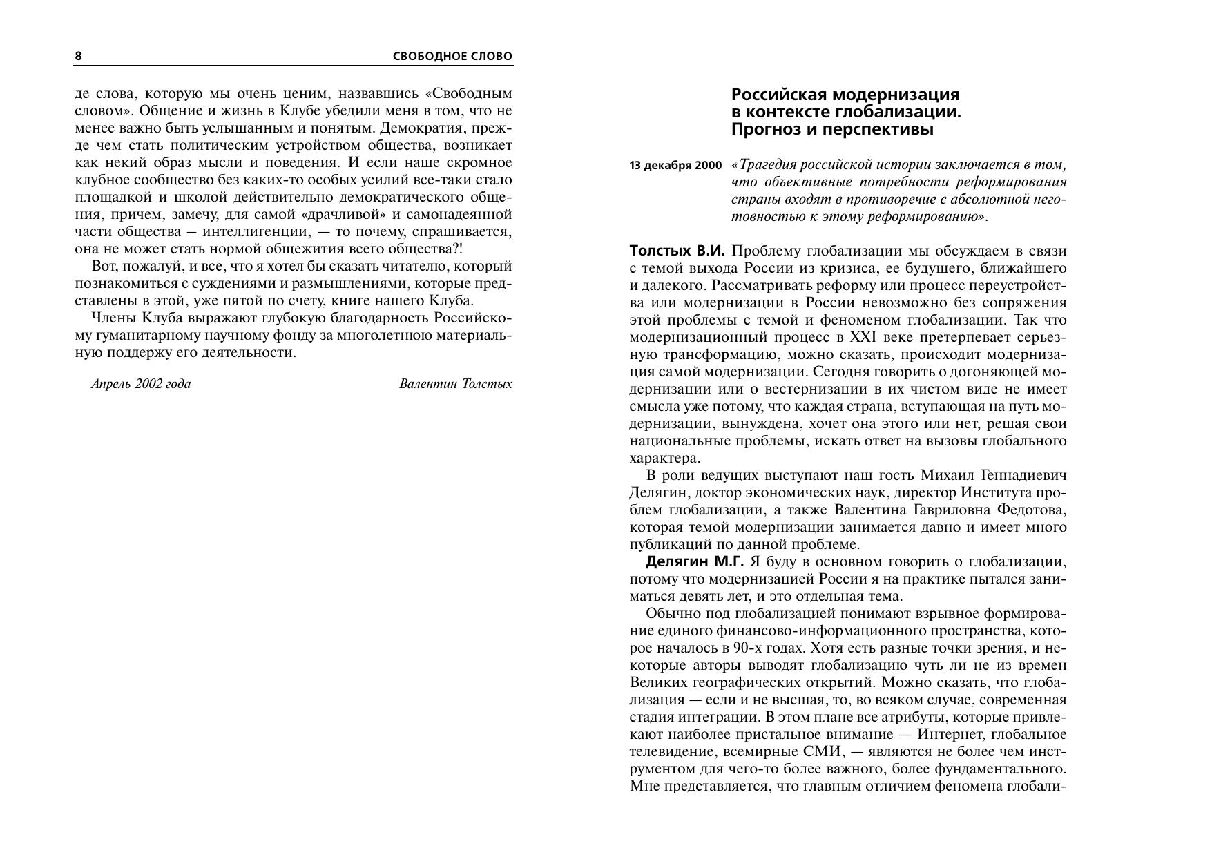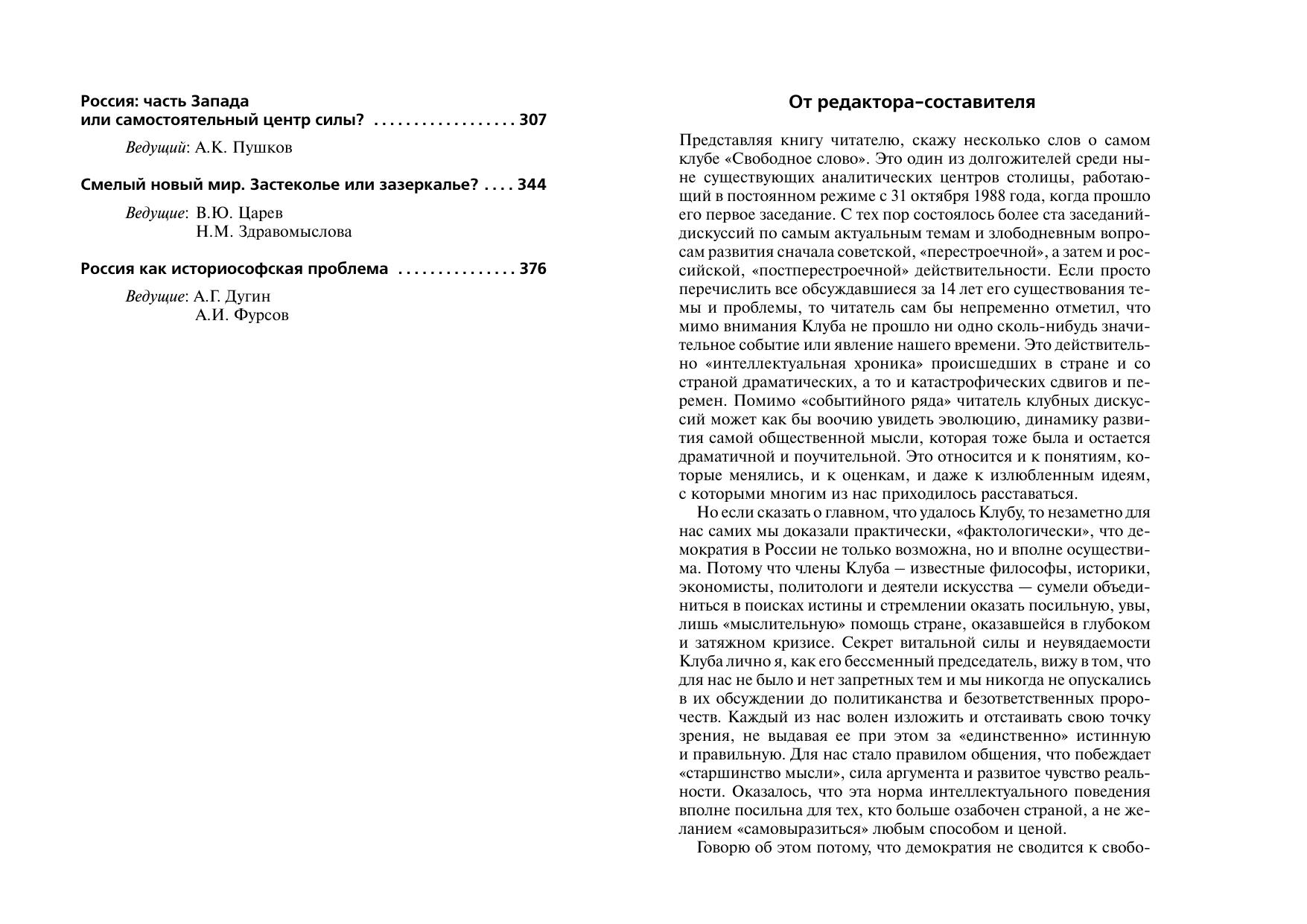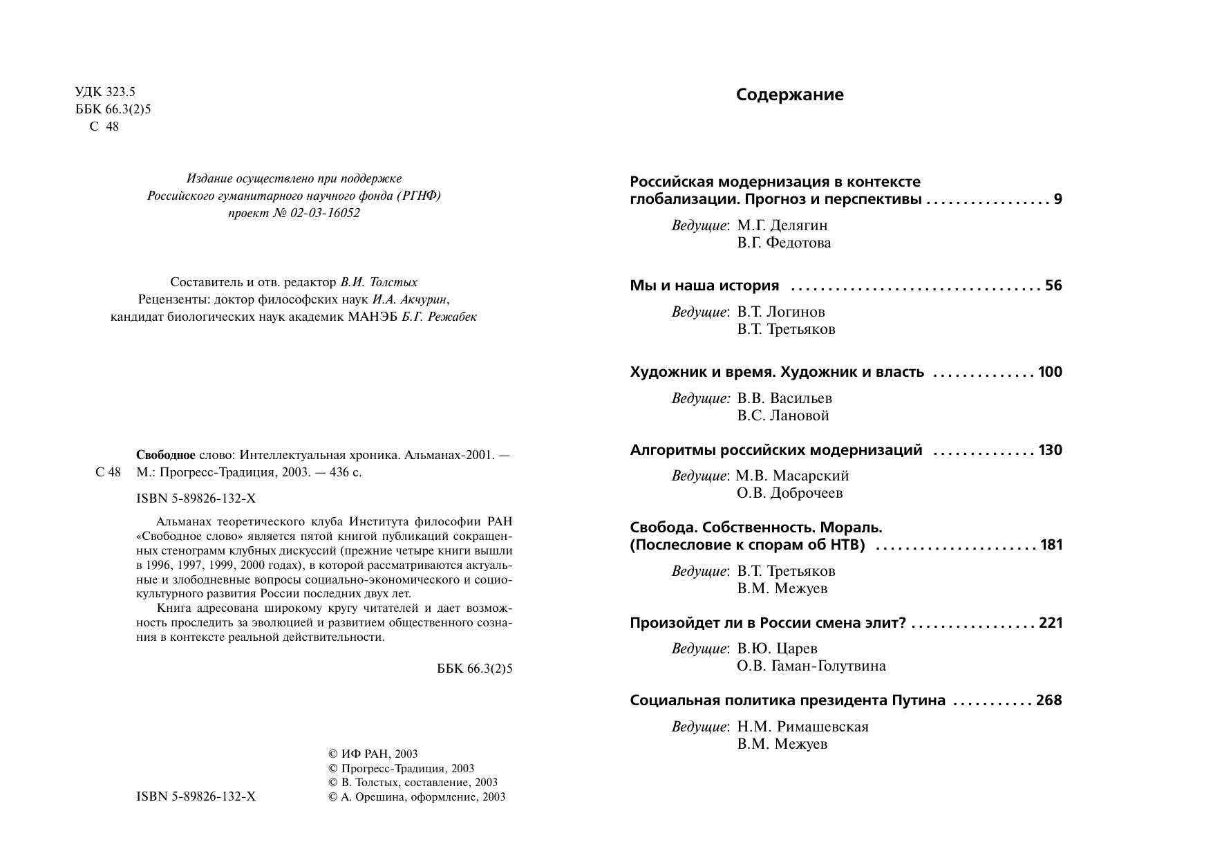 Альманах теоретического клуба Института философии РАН "Свободное слово" является пятой книгой публикаций сокращенных стенограмм клубных дискуссий (прежние четыре книги вышли в 1996, 1997, 1999, 2000 годах), в которой рассматриваются актуальные и злободневные вопросы социально-экономического и социокультурного развития России последних двух лет.
