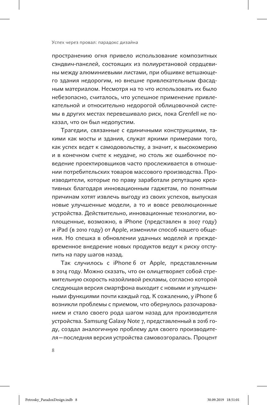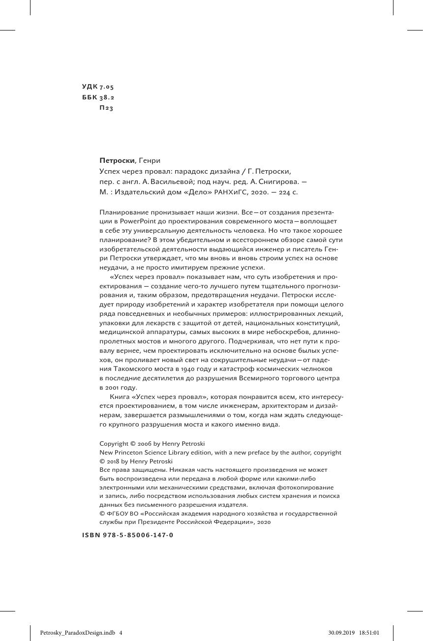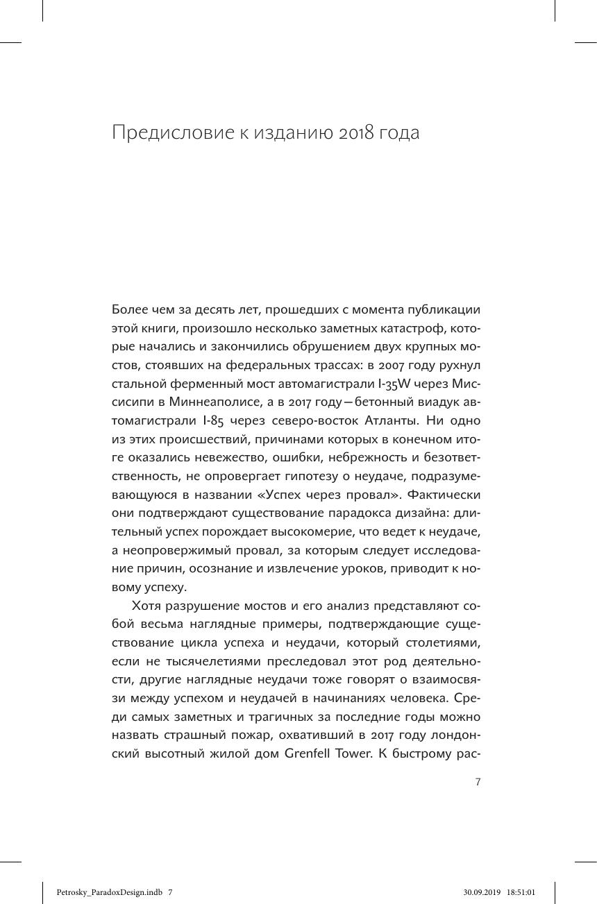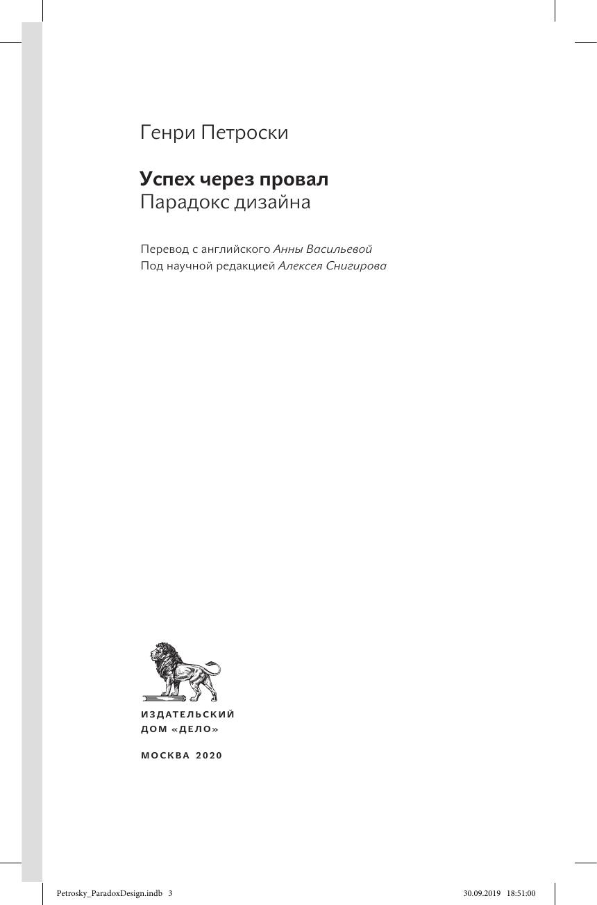 Планирование пронизывает наши жизни. Все — от создания презентации в PowerPoint до проектирования современного моста — воплощает в себе эту универсальную деятельность человека. Но что такое хорошее планирование? В этом убедительном и всестороннем обзоре самой сути изобретательской деятельности выдающийся инженер и писатель Генри Петроски утверждает, что мы вновь и вновь строим успех на основе неудачи, а не просто имитируем прежние успехи. «Успех через провал» показывает нам, что суть изобретения и проектирования — создание чего-то лучшего путем тщательного прогнозирования и, таким образом, предотвращения неудачи. Петроски исследует природу изобретений и характер изобретателя при помощи целого ряда повседневных и необычных примеров: иллюстрированных лекций, упаковки для лекарств с защитой от детей, национальных конституций, медицинской аппаратуры, самых высоких в мире небоскребов, длиннопролетных мостов и многого другого. Подчеркивая, что нет пути к провалу вернее, чем проектировать исключительно на основе былых успехов, он проливает новый свет на сокрушительные неудачи — от падения Такомского моста в 1940 году и катастроф космических челноков в последние десятилетия до разрушения Всемирного торгового центра в 2001 году. Книга «Успех через провал», которая понравится всем, кто интересуется проектированием, в том числе инженерам, архитекторам и дизайнерам, завершается размышлениями о том, когда нам ждать следующего крупного разрушения моста и какого именно вида.