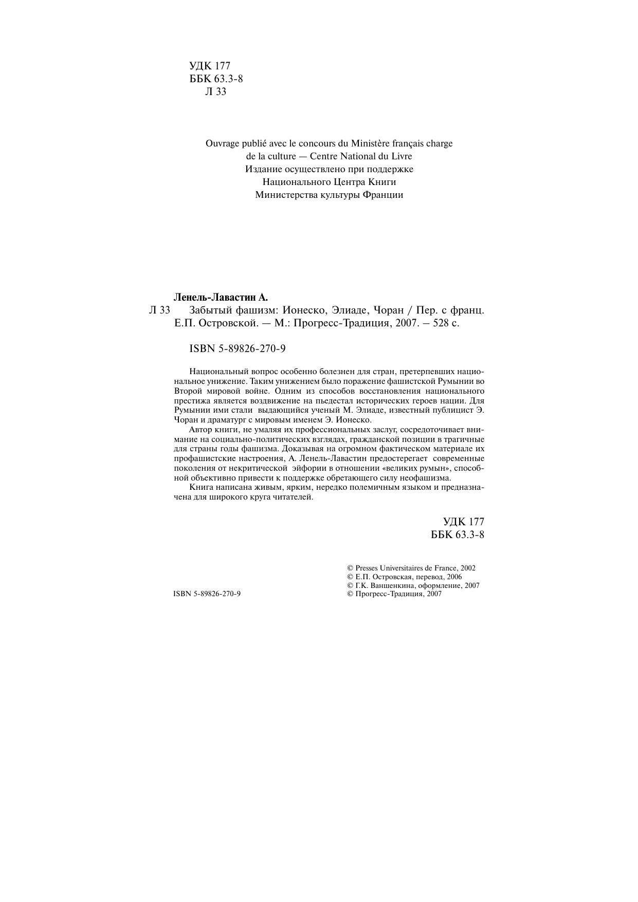 Автор книги, не умаляя их профессиональных заслуг, сосредоточивает внимание на социально-политических взглядах, гражданской позиции в трагичные для страны годы фашизма. Доказывая на огромном фактическом материале их профашистские настроения, А. Ленель-Лавастин предостерегает современные поколения от некритической эйфории в отношении "великих румын", способной объективно привести к поддержке обретающего силу неофашизма.