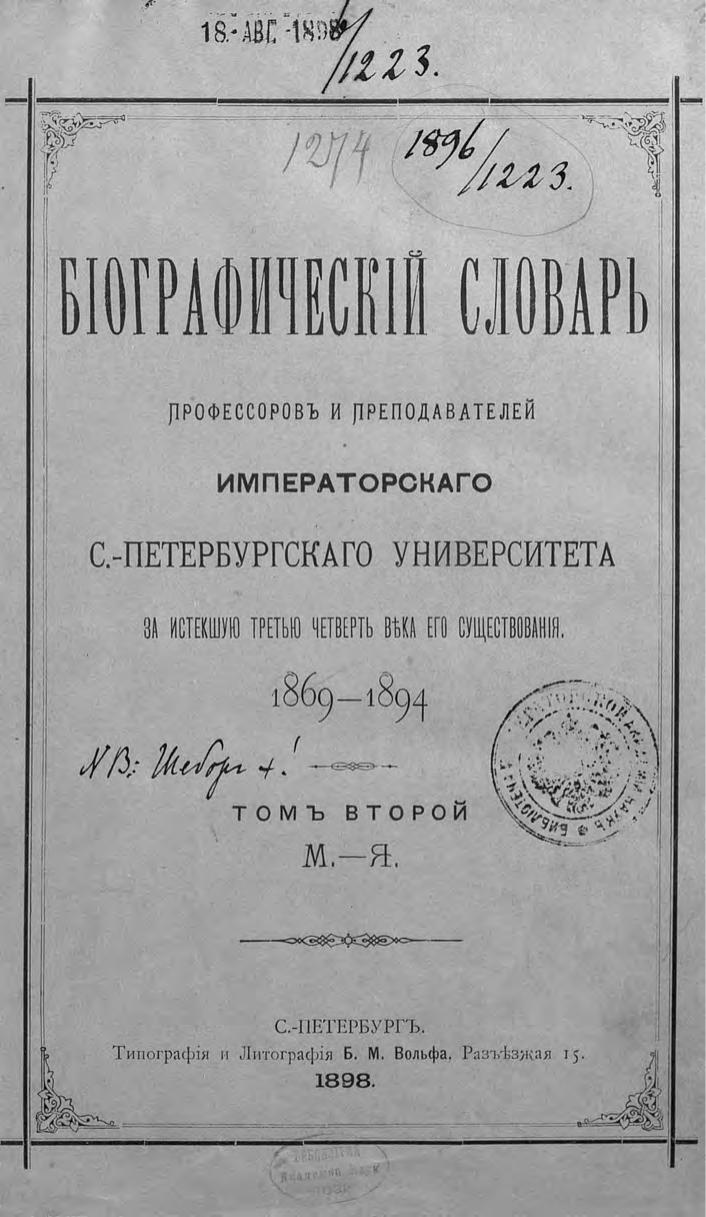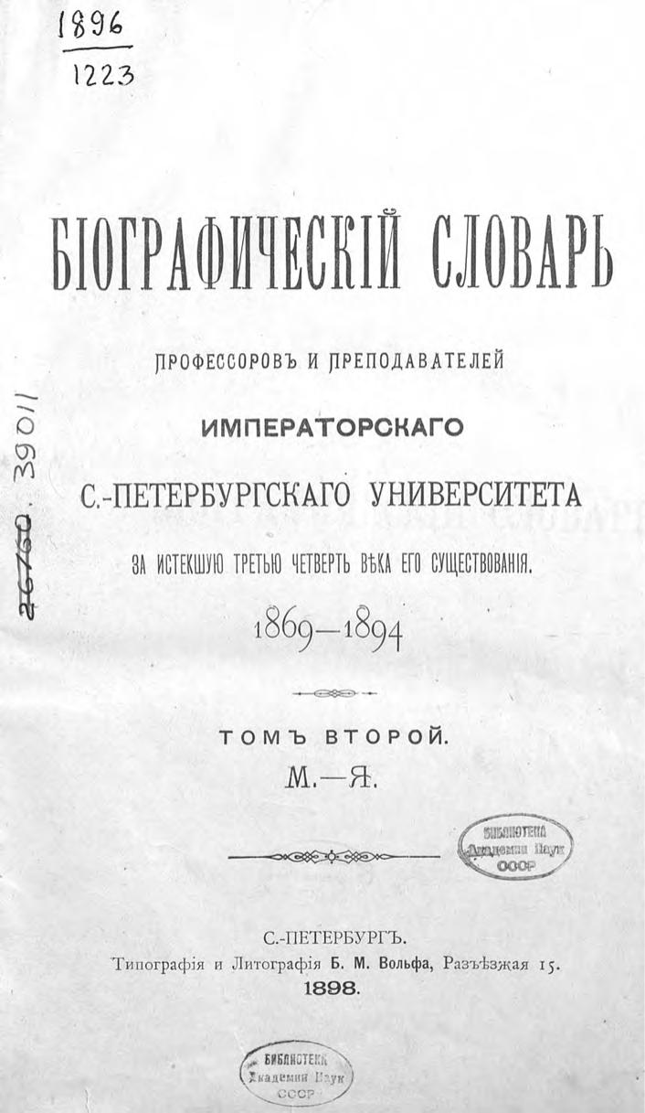 Биографический словарь профессоров и преподавателей Императорского Санкт-Петербургского университета за истекшую третью четверть века его существования. 1869-1894. Том 2