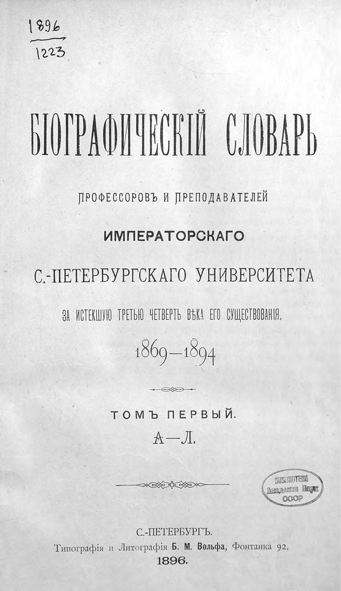 Биографический словарь профессоров и преподавателей Императорского Санкт-Петербургского университета за истекшую третью четверть века его существования. 1869-1894. Том 1