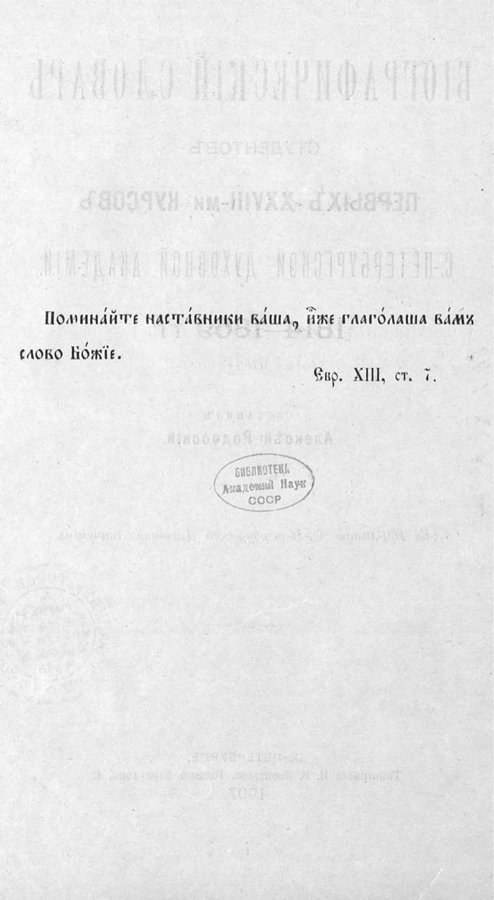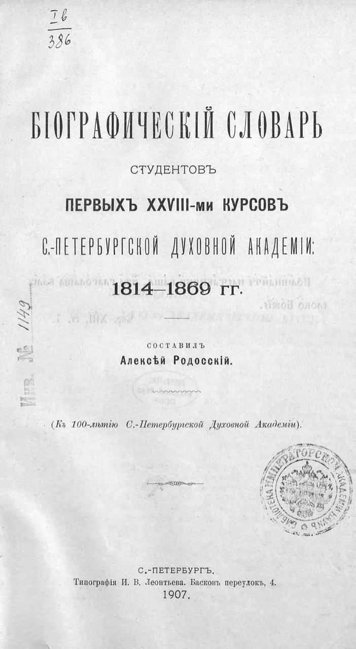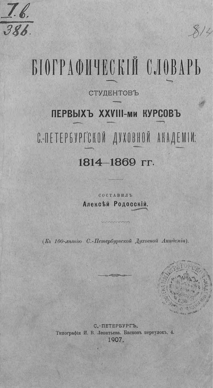 Биографический словарь студентов первых XXVIII-ми курсов Санкт-Петербургской Духовной Академии: 1814-1869 гг.