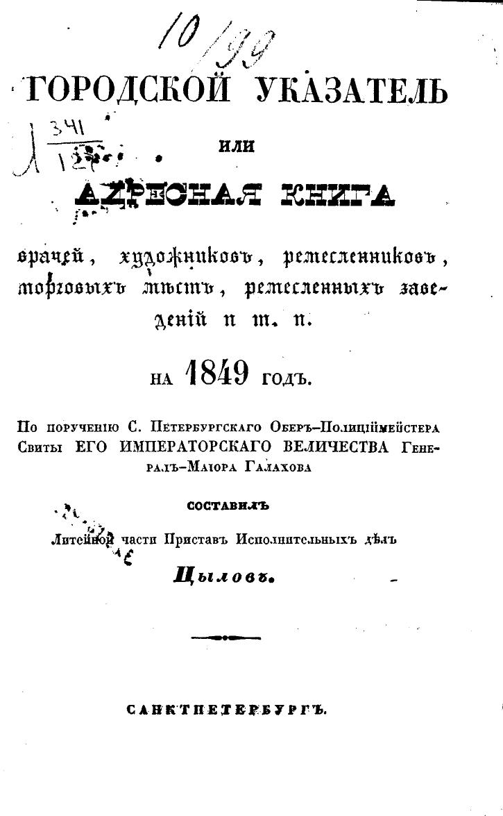 Городской указатель, или Адресная книга врачей, художников, ремесленников, торговых мест, ремесленных заведений и т. п. на 1849 год