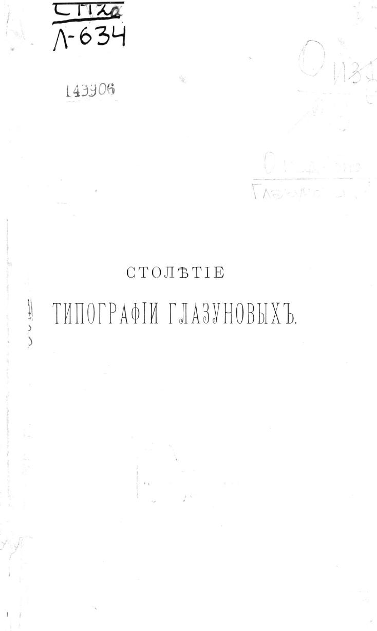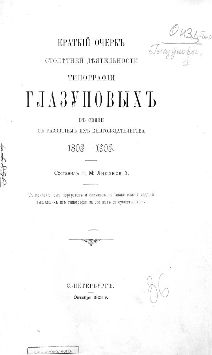 Краткий очерк столетней деятельности типографии Глазуновых в связи с развитием их книгоиздательства 1803-1903 : С прил. портретов и снимков, а также списка изданий, вышедших из типографии за сто лет ее существования