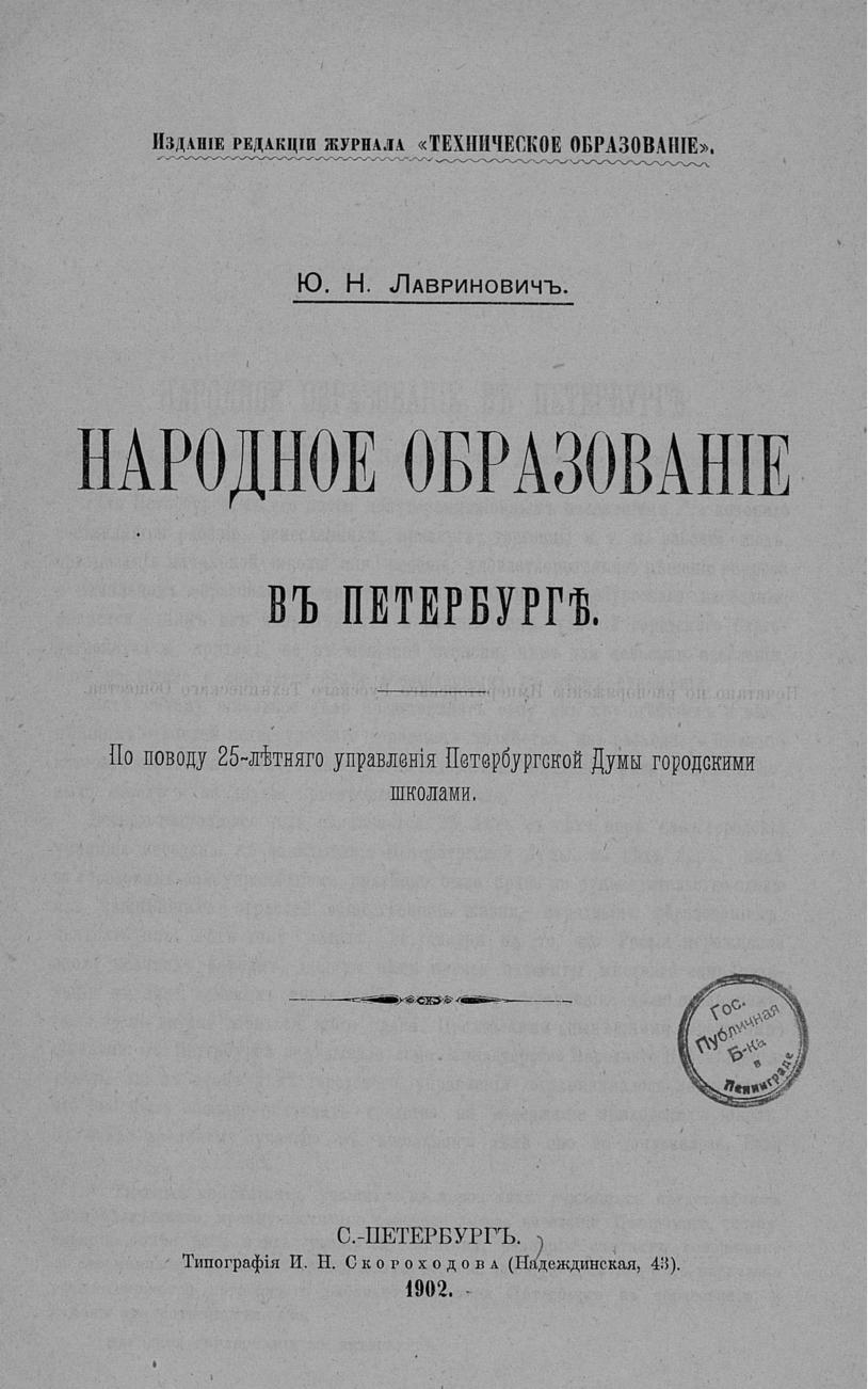 Перешедшие в общественное достояние материалы электронного фонда ЦГПБ им. В.В. Маяковского. Сведения о издательстве или типографии: тип. И. Н. Скороходова. Место издания: СПб.