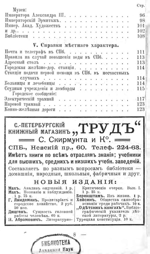Новейший путеводитель по Санкт-Петербургу с планом города, с маршрутами, остановками и тарифом трамваев, конных и паровых железных дорог, омнибусов и кареток : С полезными сведениями и указаниями достопримечетельностей города