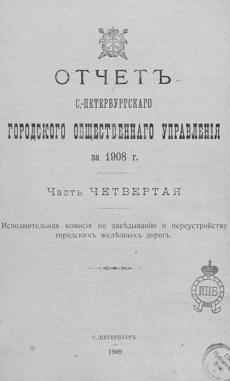 Отчет городской управы за 1908 г. Ч. 4-5 : Исполнительная комиссия по заведыванию и переустройству городских железных дорог. Комиссия по водоснабжению. Комиссия по освещению. Пожарная комиссия. Курсы пожарных техников