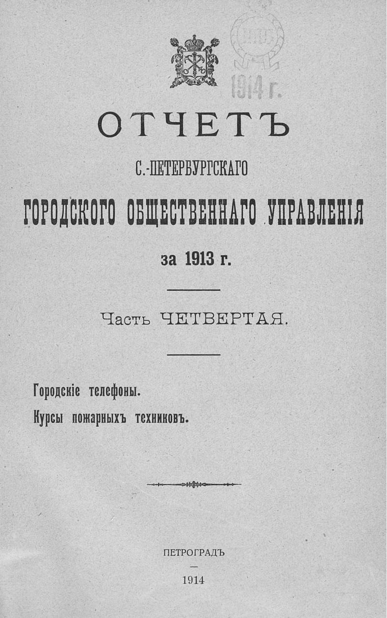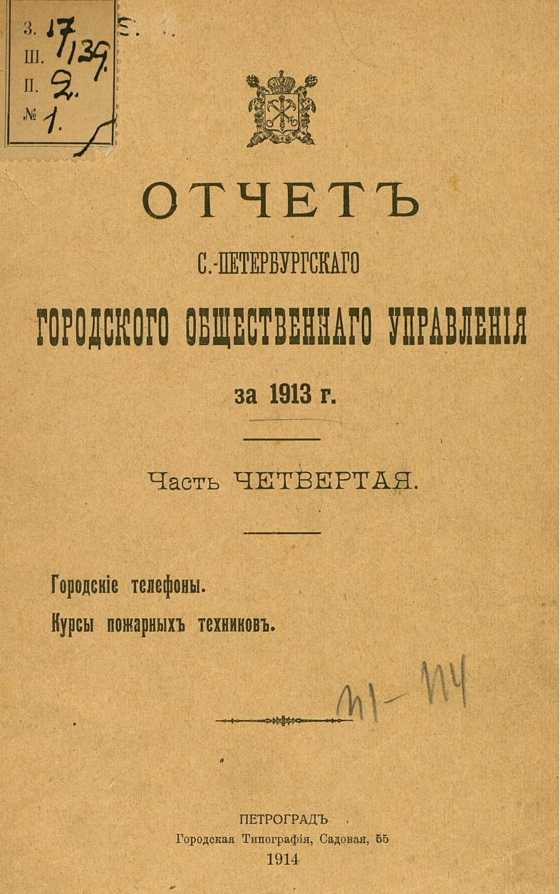 Отчет городской управы за 1913 г. Ч. 4-5 : Городские телефоны. Курсы пожарных техников. Особое присутствие по разбору и призрению нищих