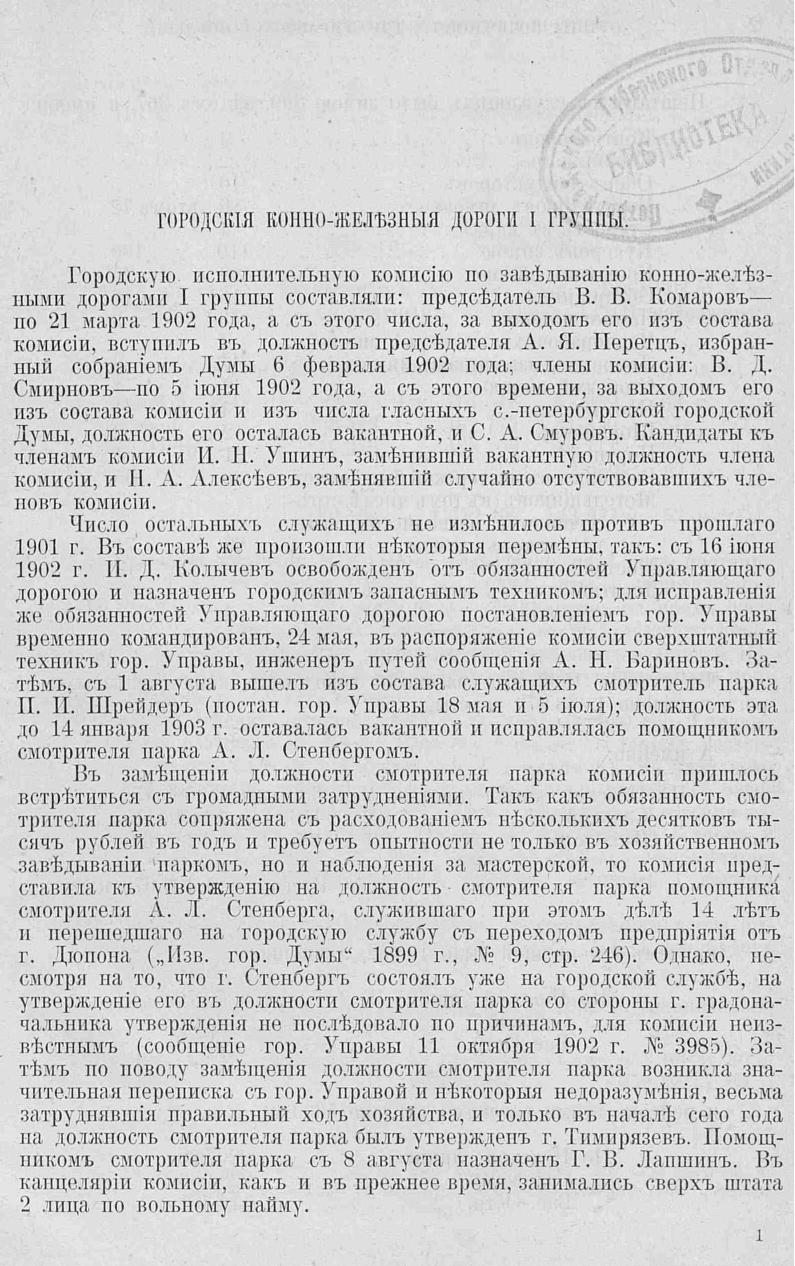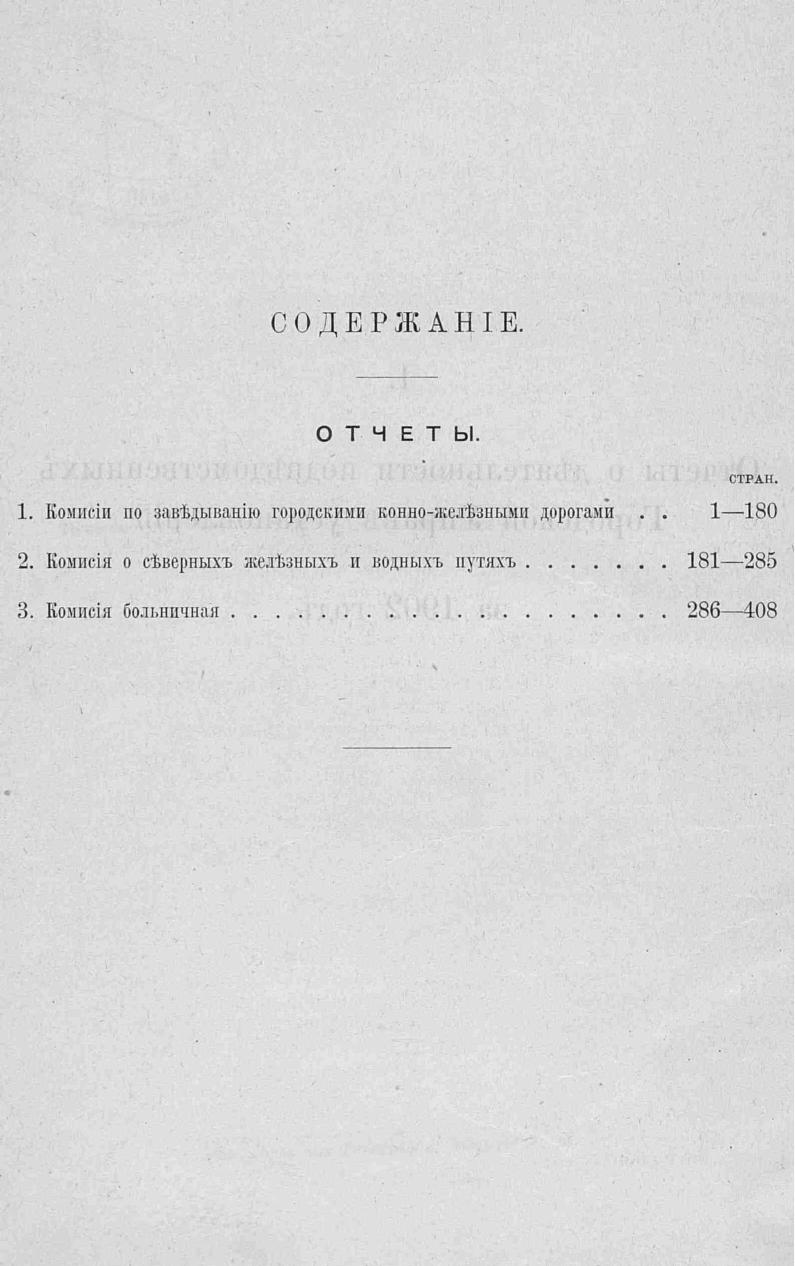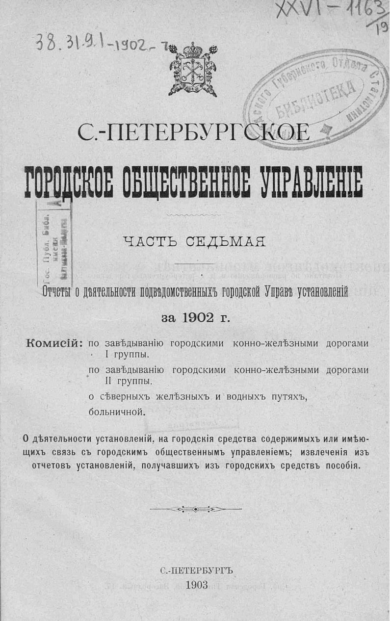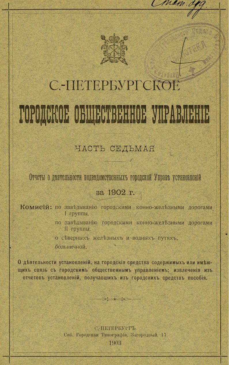 Отчет городской управы за 1902 г. Ч. 7 : Отчеты о деятельности подведомственных Городской управе установлений: Комиссий по заведыванию городскими конно-железными дорогами; о северных железных и водных путях; о больничной