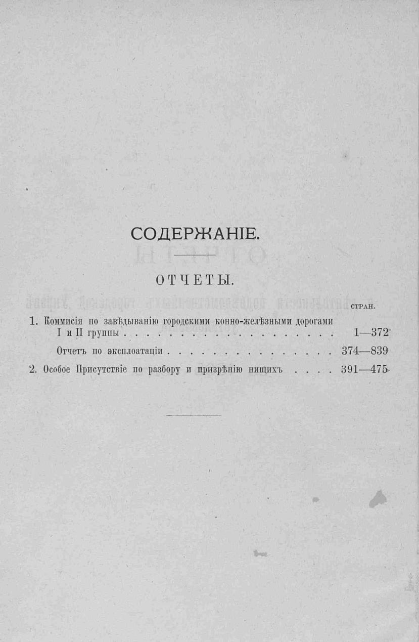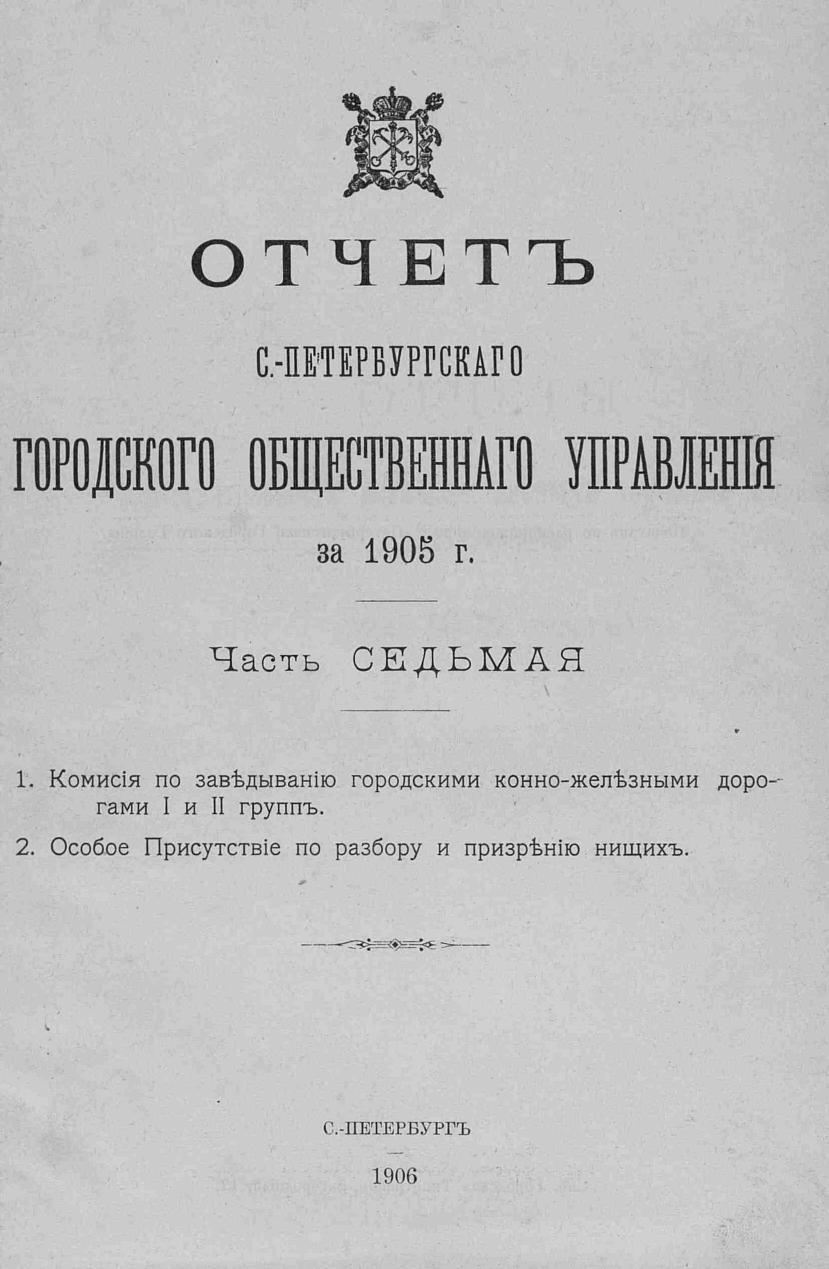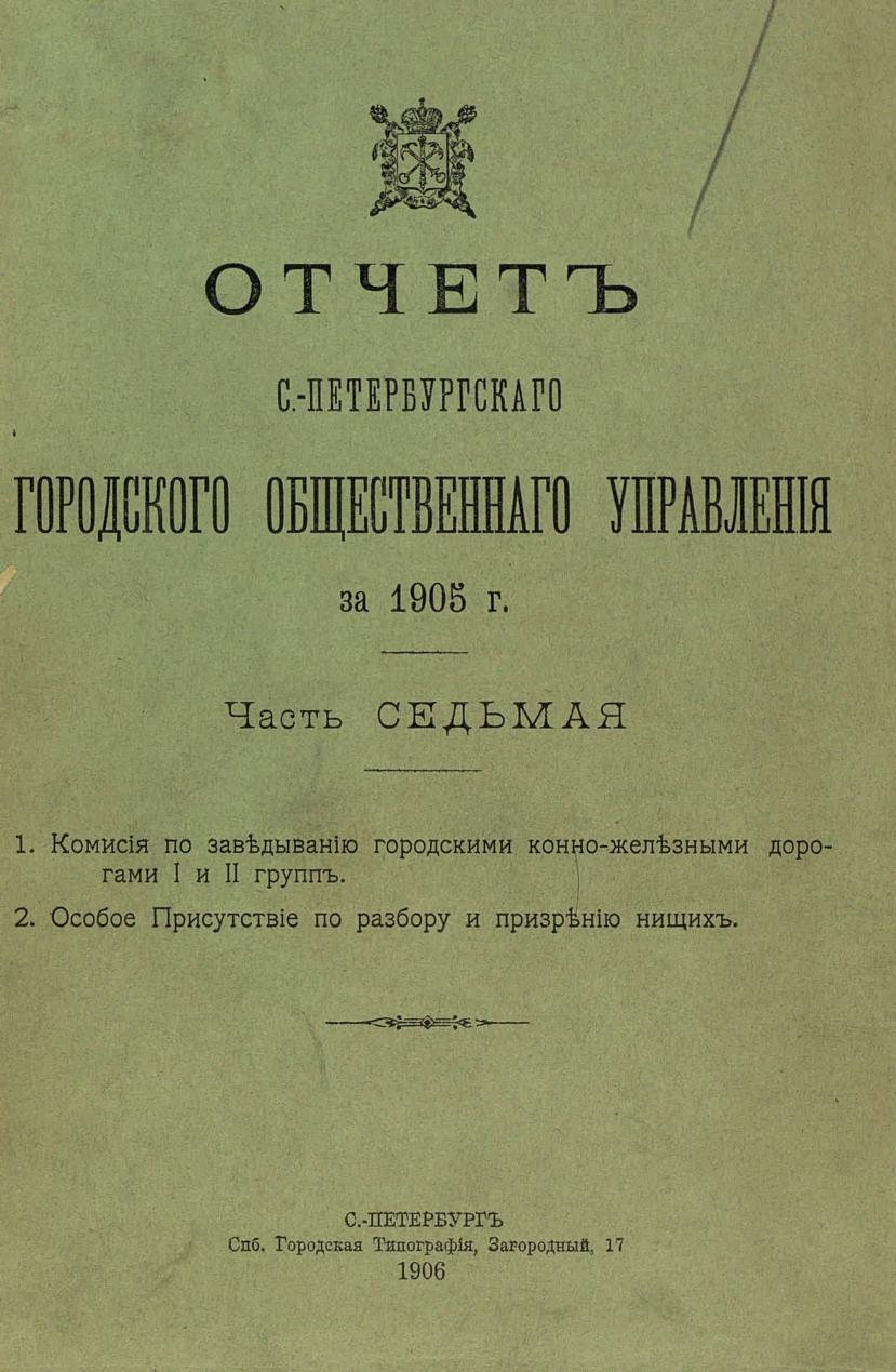 Отчет городской управы за 1905 г. Ч. 7 : Комиссия по заведыванию городскими конно-железными дорогами I и II групп; Особое присутствие по разбору и призрению нищих
