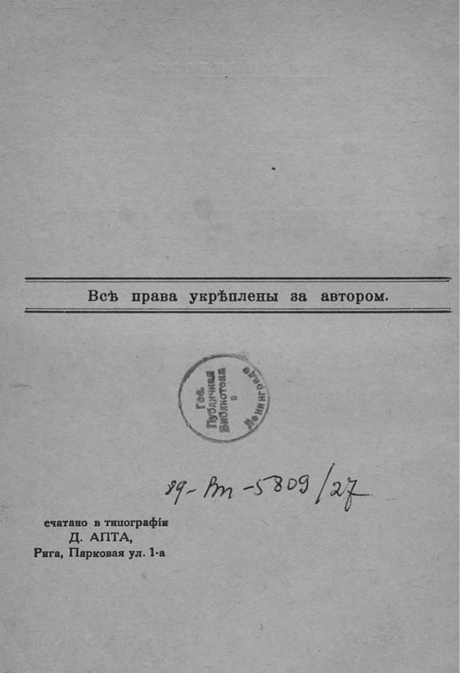 Перешедшие в общественное достояние материалы электронного фонда ЦГПБ им. В.В. Маяковского. Сведения о издательстве или типографии: Книга для всех. Место издания: Рига