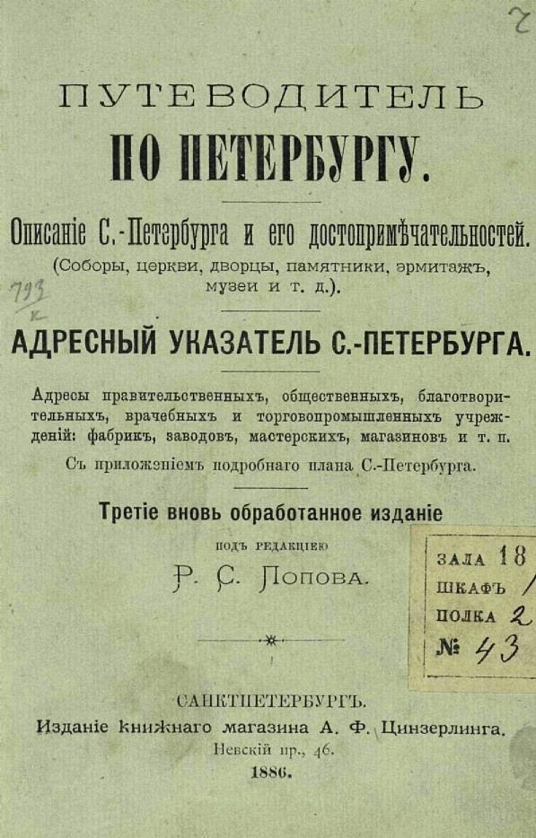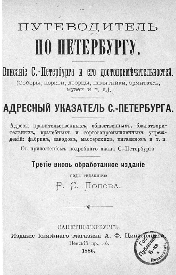 Путеводитель по Петербургу: Описание С.-Петербурга и его достопримечательностей (Соборы, церкви, дворцы, памятники, эрмитаж, музеи и т .д.) : Адресный указатель С.-Петербурга: адреса правительств., обществ., благотвор., врачеб. и торговопром. учреждений: