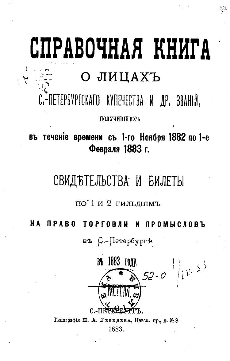 Справочная книга о купцах С.-Петербурга на 1883 год Петербургская купеческая управа