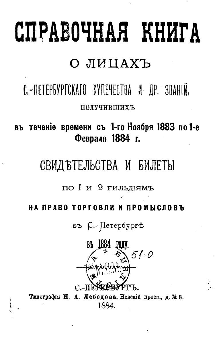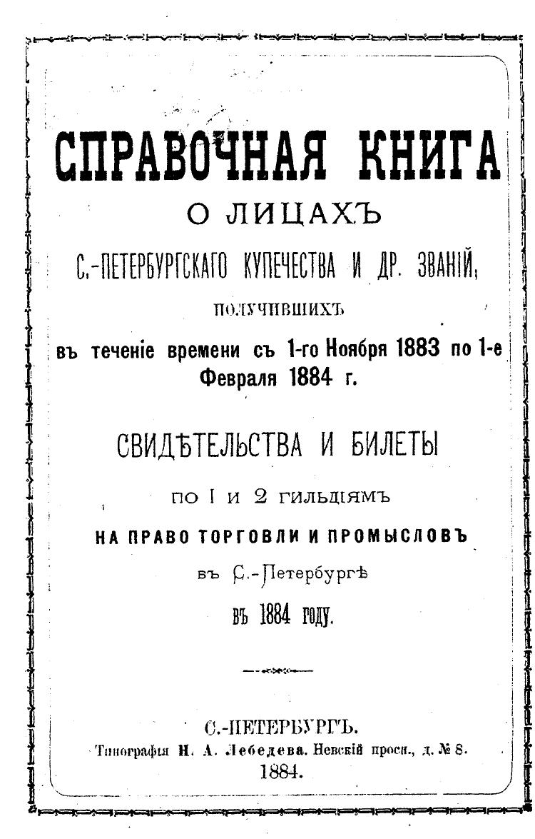 Справочная книга о купцах С.-Петербурга на 1884 год Петербургская купеческая управа