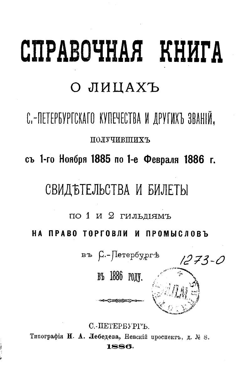 Справочная книга о купцах С.-Петербурга на 1886 год Петербургская купеческая управа