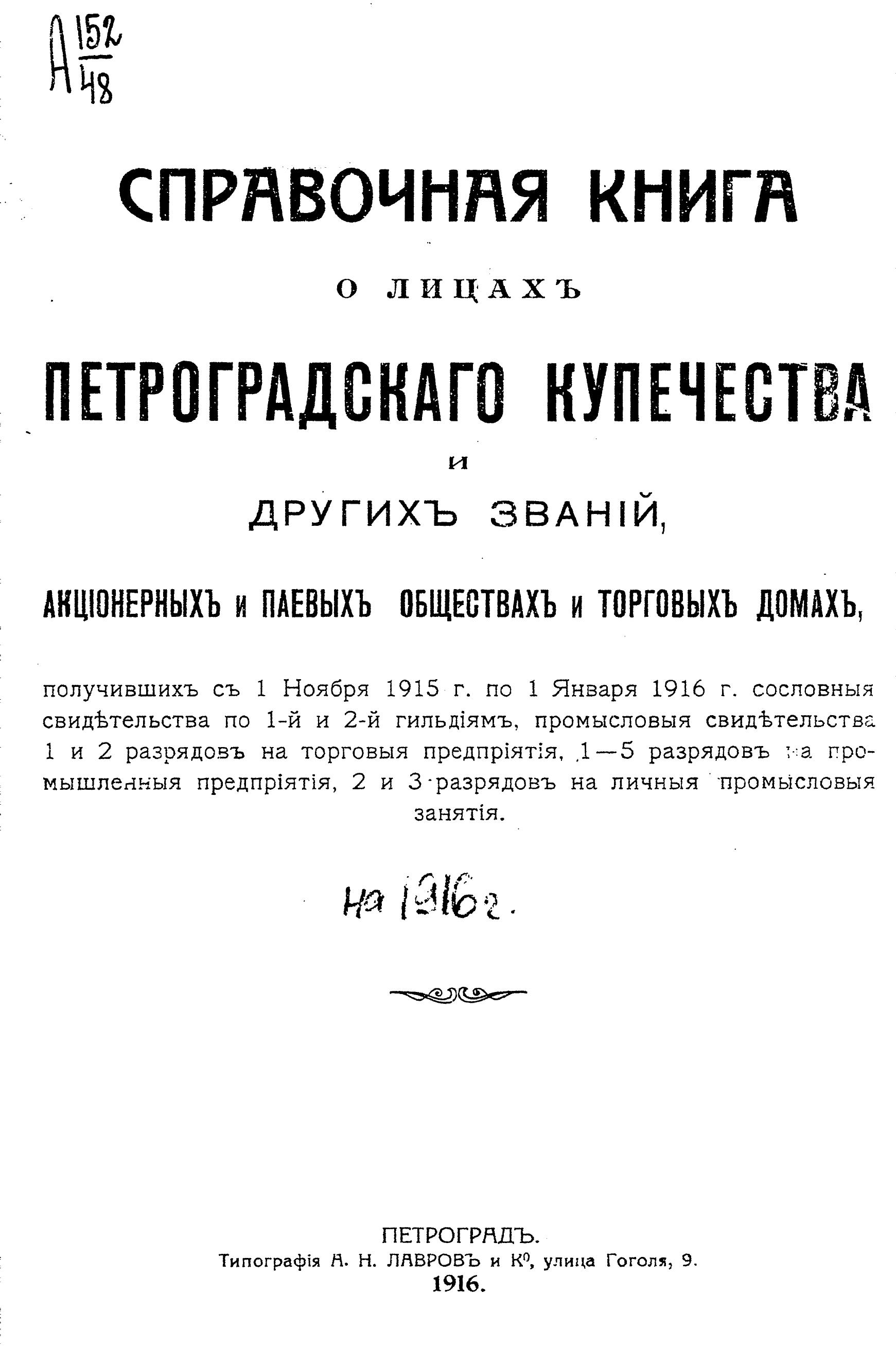 Справочная книга о купцах С.-Петербурга на 1916 год Петербургская купеческая управа