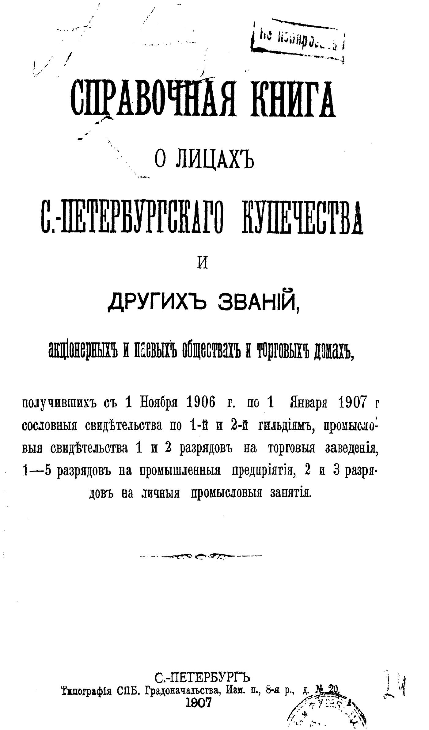 Справочная книга о купцах С.-Петербурга на 1907 год Петербургская купеческая управа
