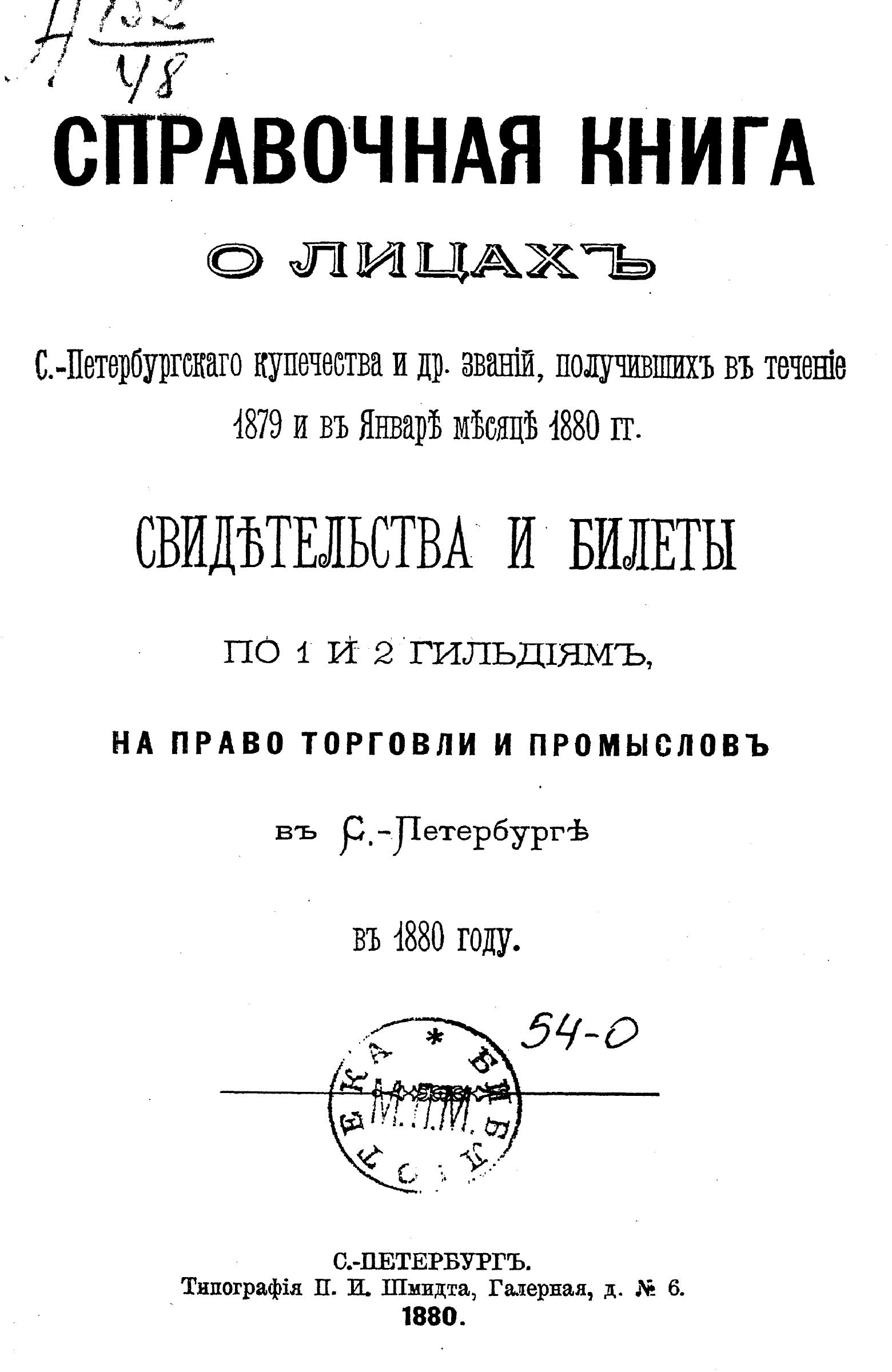 Справочная книга о купцах С.-Петербурга на 1880 год Петербургская купеческая управа