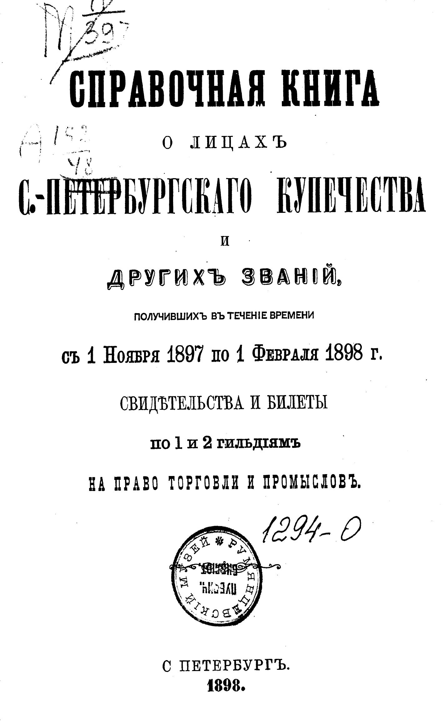 Справочная книга о купцах С.-Петербурга на 1898 год Петербургская купеческая управа