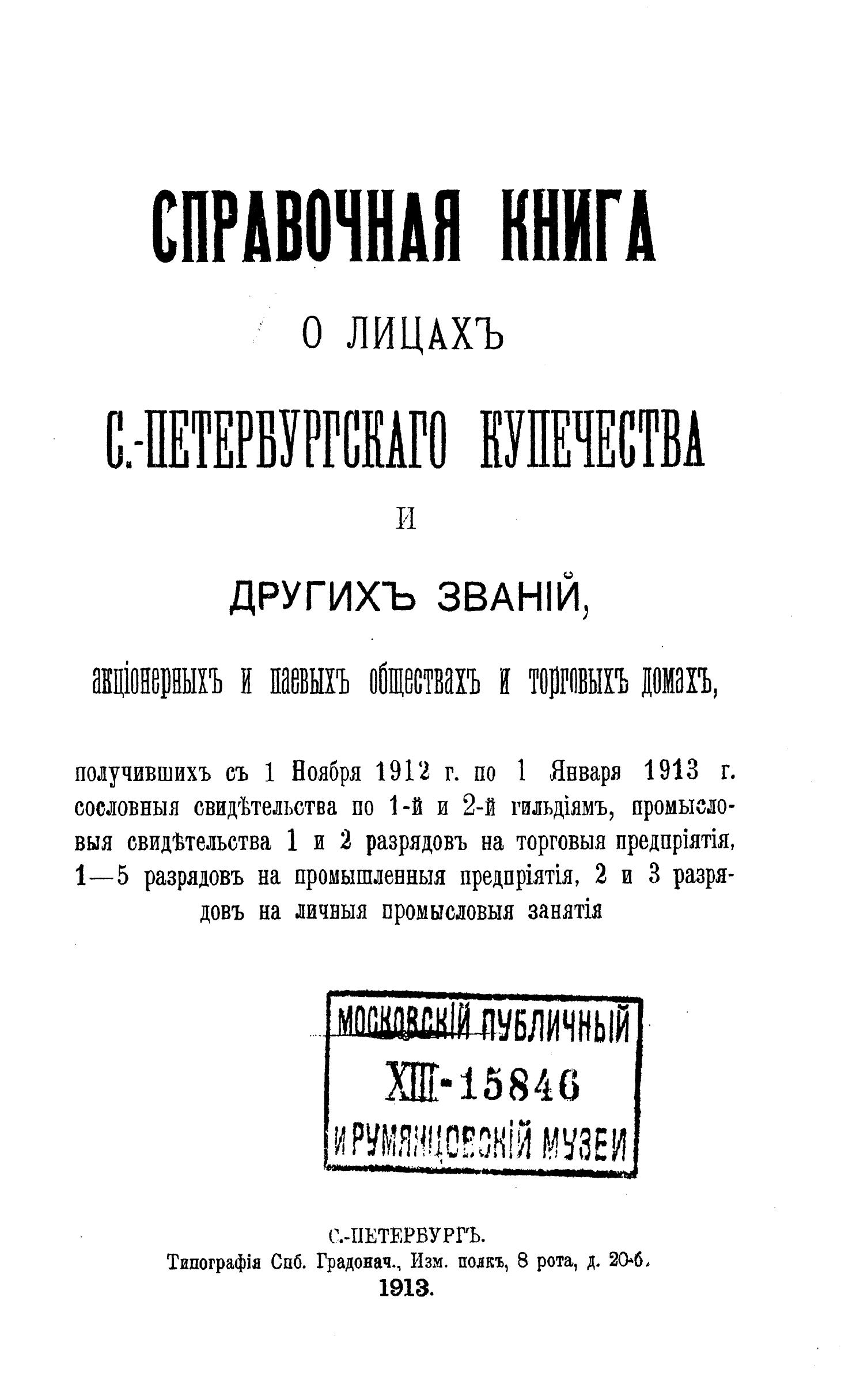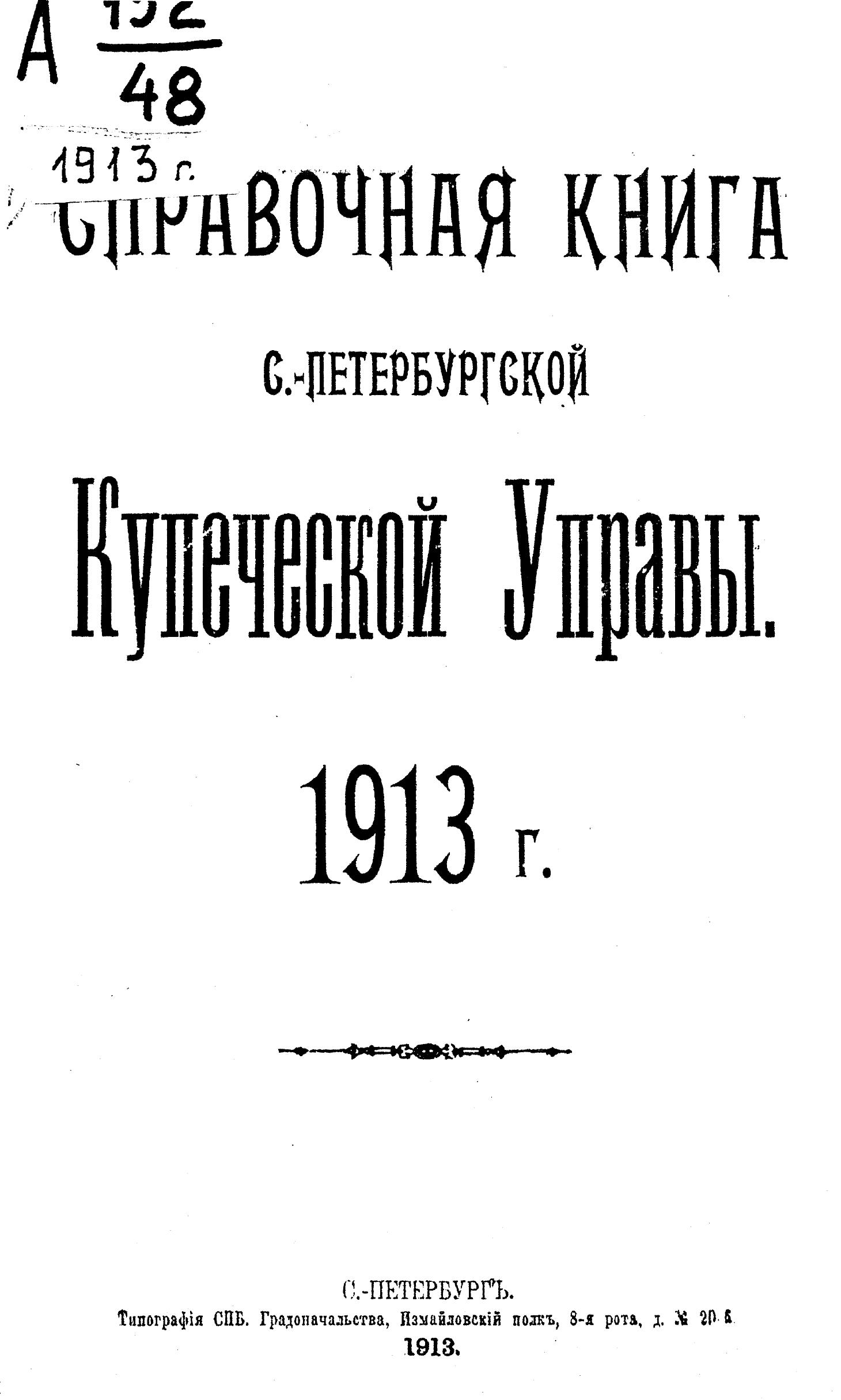 Справочная книга о купцах С.-Петербурга на 1913 год Петербургская купеческая управа