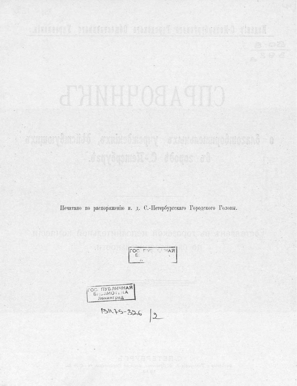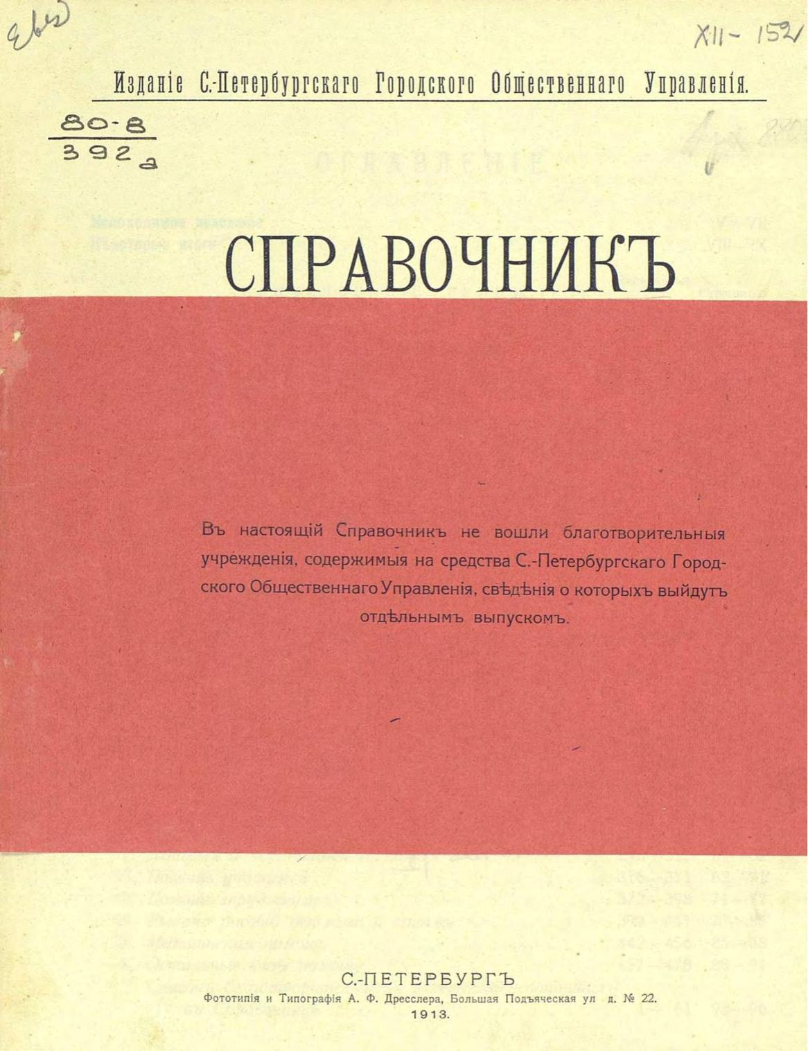 Перешедшие в общественное достояние материалы электронного фонда ЦГПБ им. В.В. Маяковского. Сведения о издательстве или типографии: Сост. в Городской исполн. комиссии по благотворительности. тип. Дресслера. Место издания: СПб.