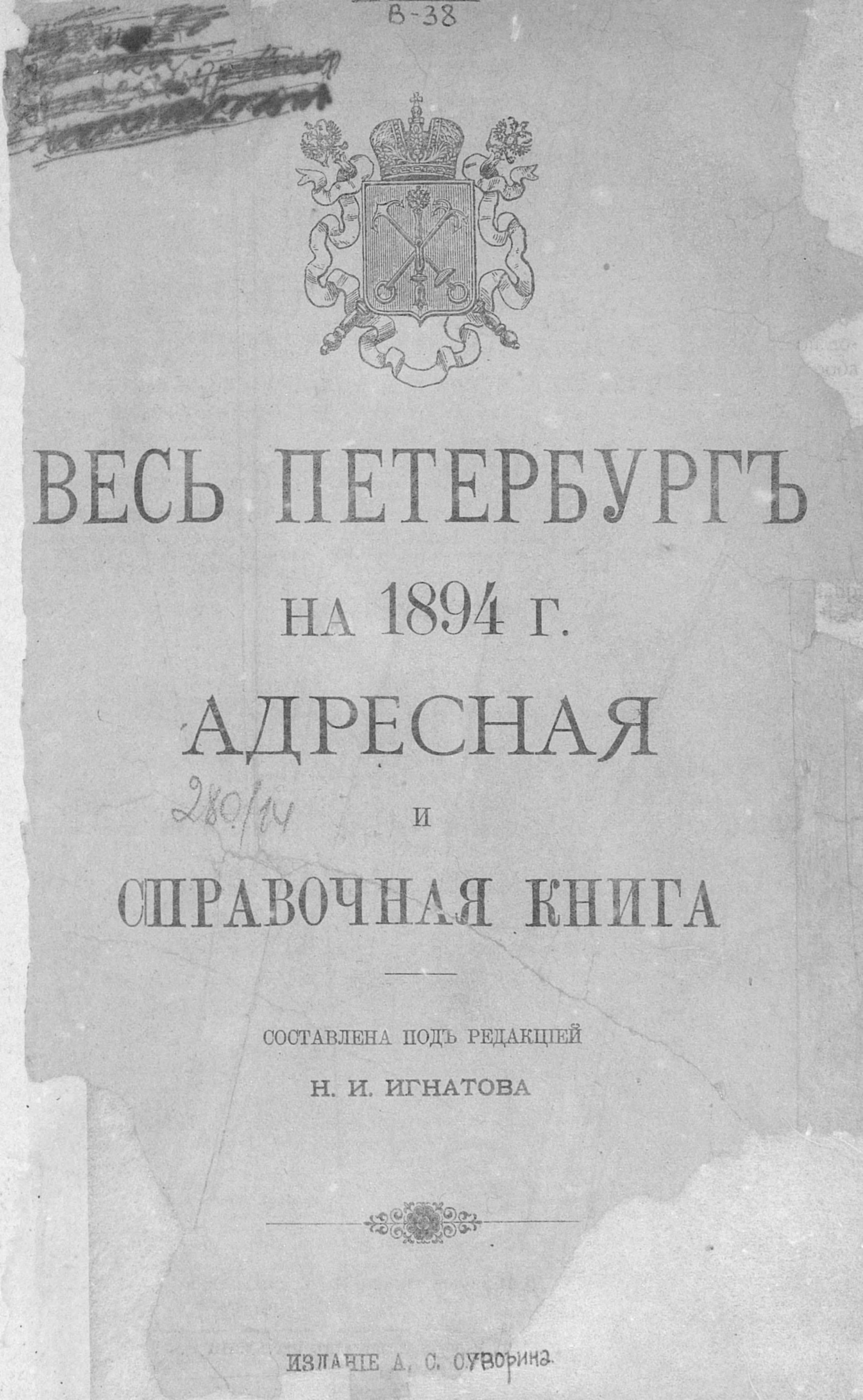 Перешедшие в общественное достояние материалы электронного фонда ЦГПБ им. В.В. Маяковского. Сведения о издательстве или типографии: изд. А. С. Суворина. Место издания: СПб.