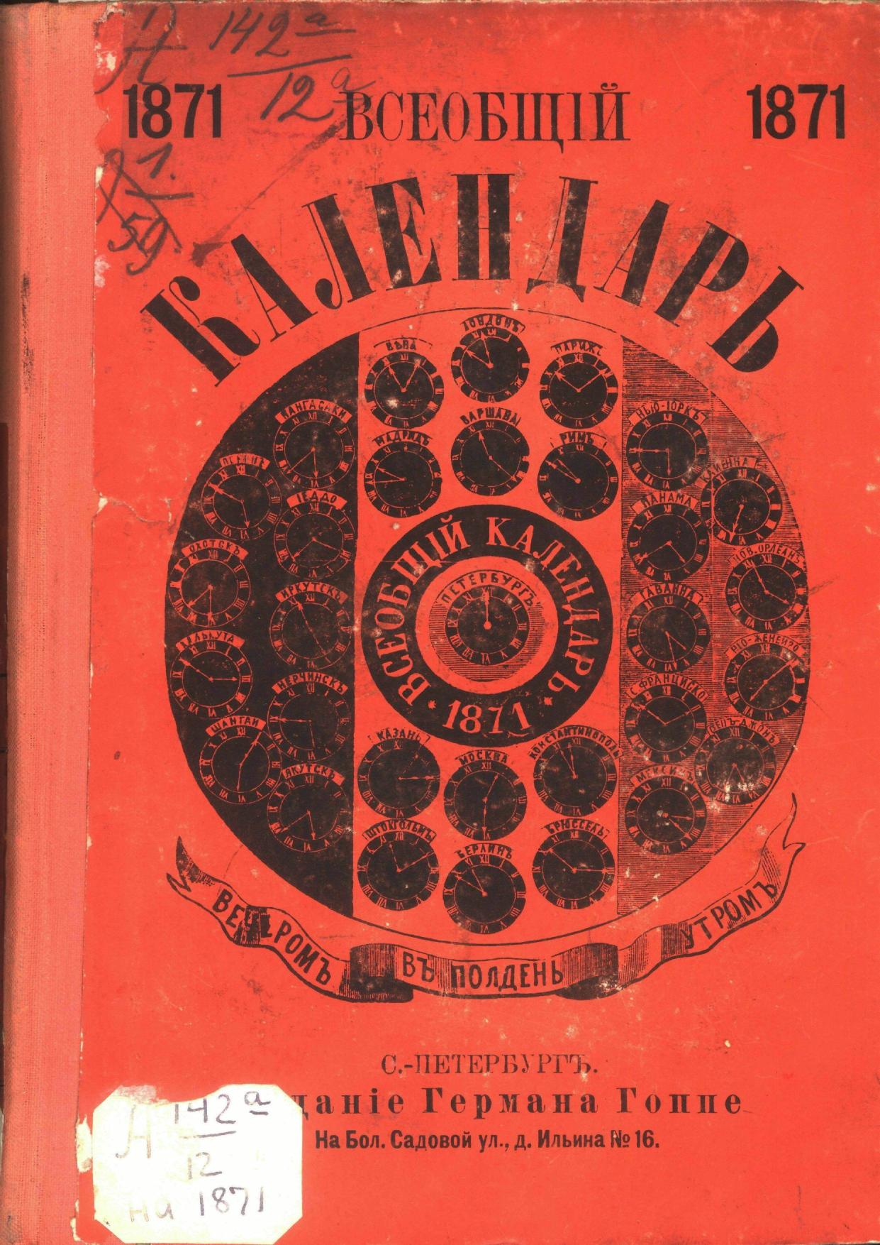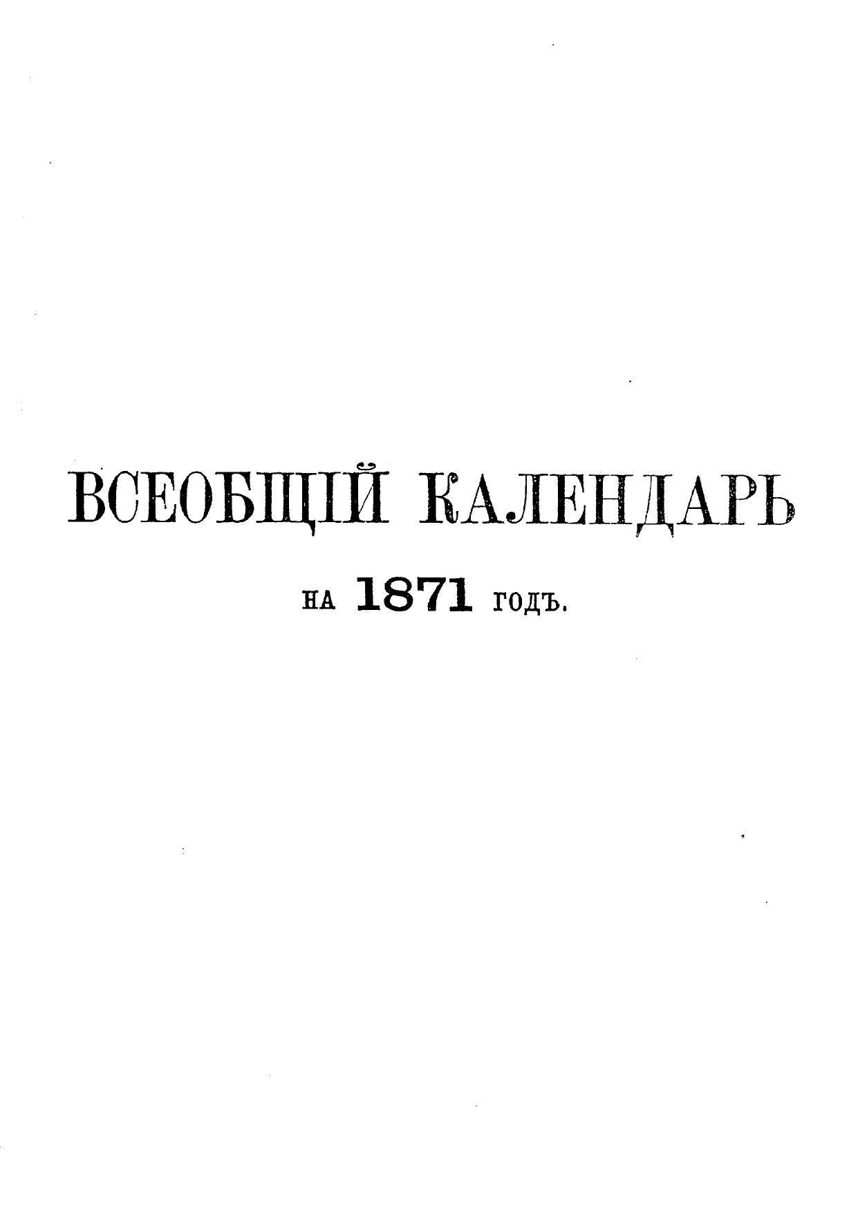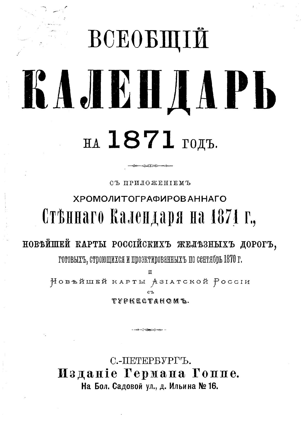 Всеобщий календарь на 1871 г. с прил. хромолитогр. стенного календаря, новейшей карты рос. ж. д., готовых строящихся и проектированных по сент. 1870 г. и новейшей карты Азиат. России с Туркестаном