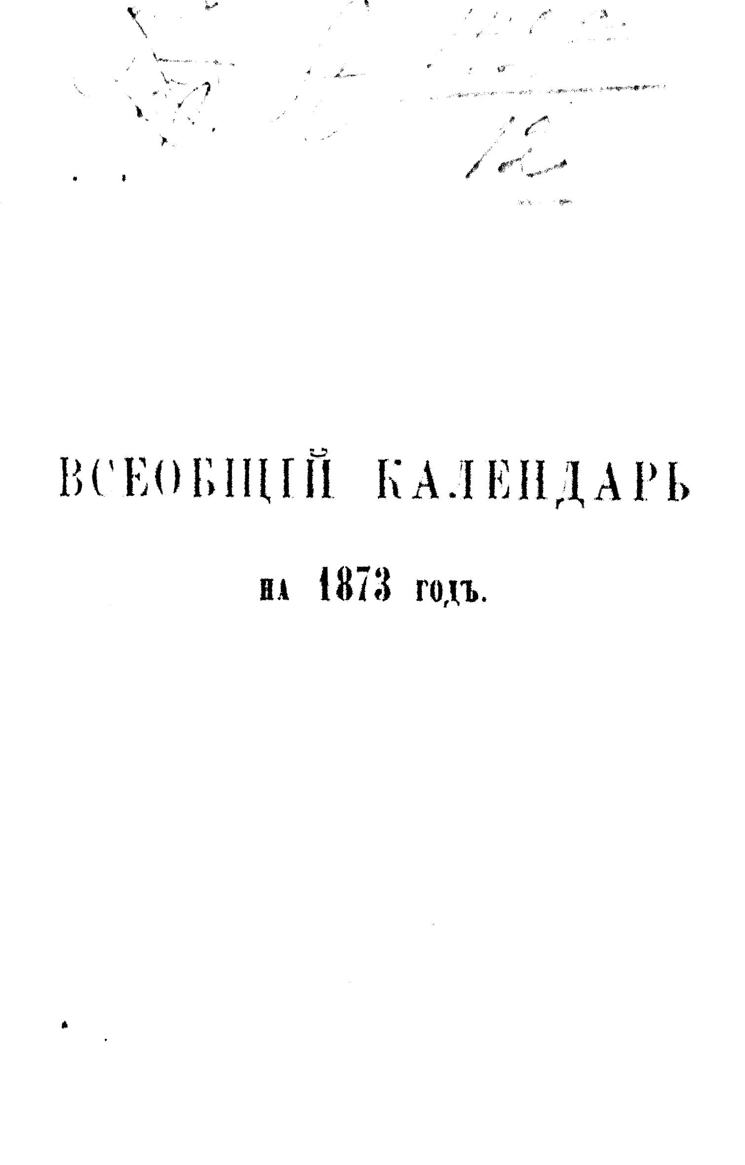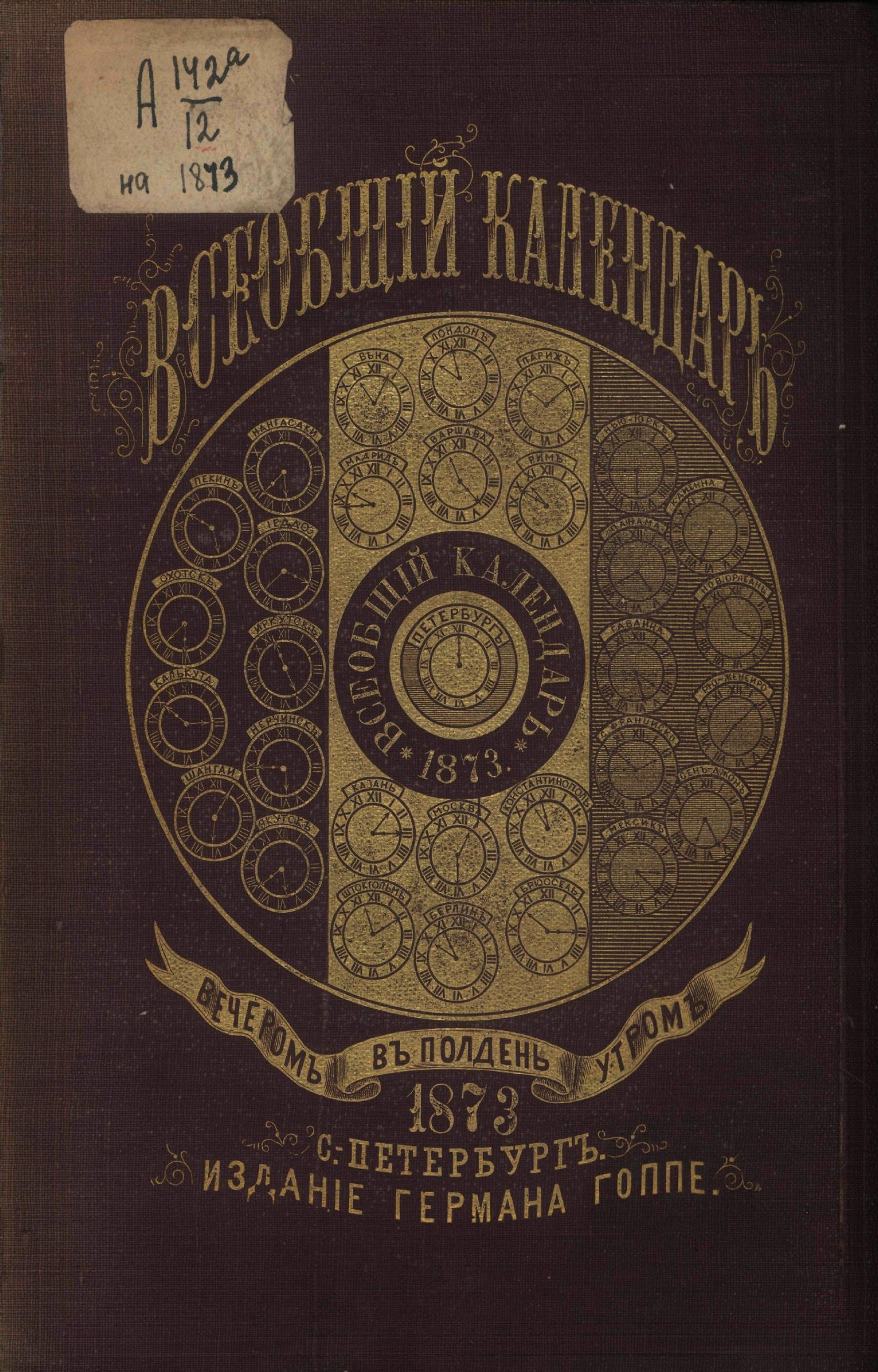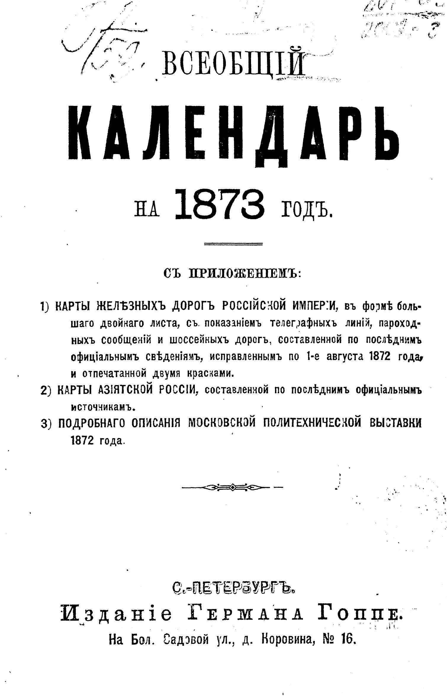 Всеобщий календарь на 1873 г. с прил.: 1) карты ж. д. Рос. империи, сост. по последним офиц. сведениям, испр. по 1-е авг. 1872 г., 2) карты Азиат. России, сост. по последним офиц. источникам, 3) подробного описания Моск. политехн. выставки 1872 г.