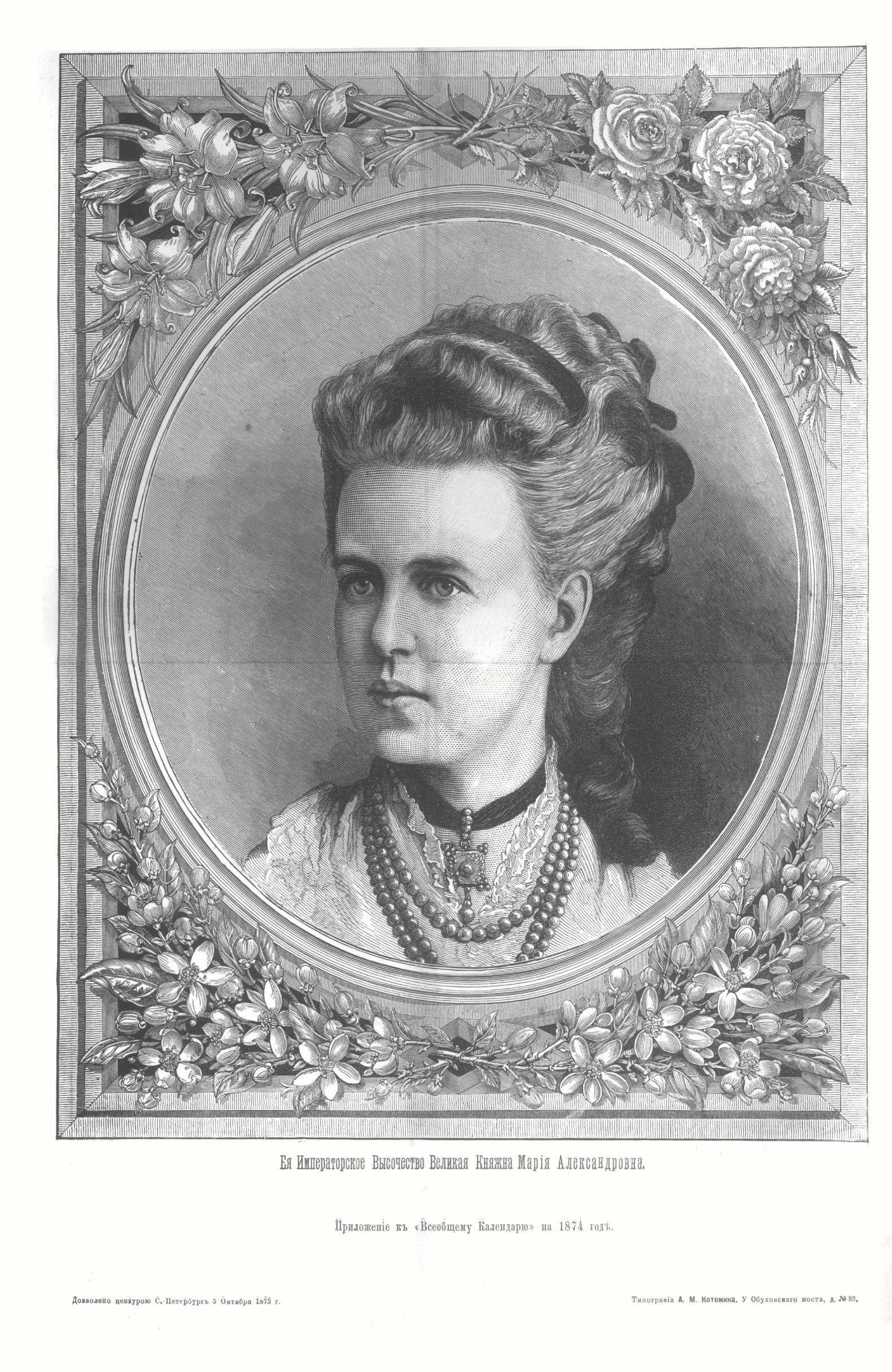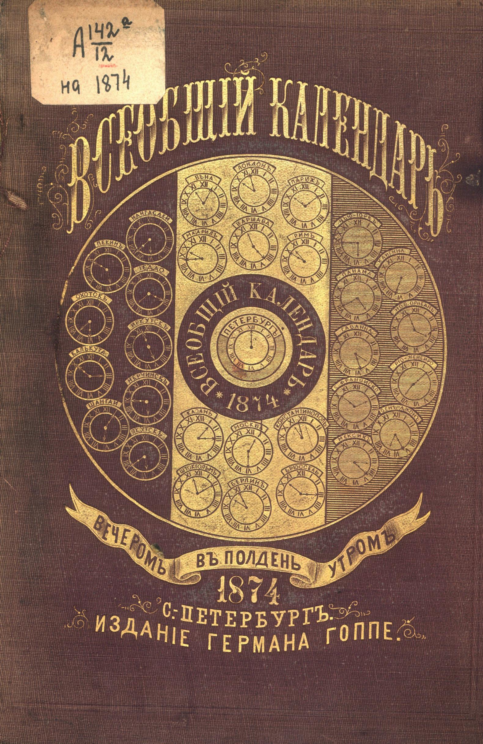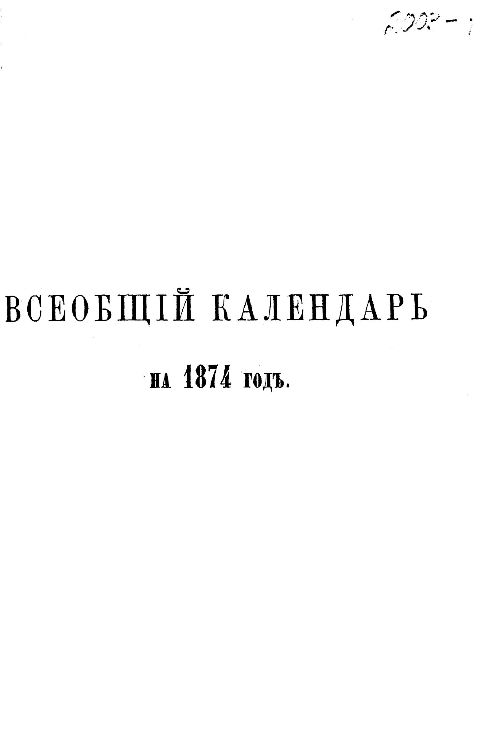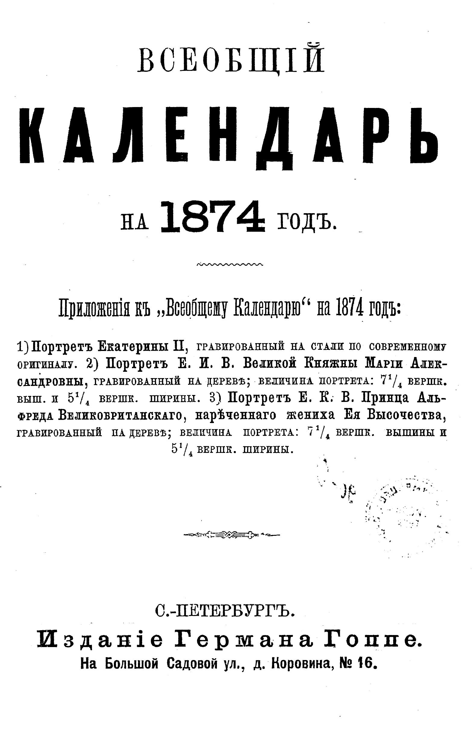 Всеобщий календарь на 1874 г. с прил. портр.: Екатерины II, Е.И.В. Вел. княжны Марии Александровны, Е.К.В. принца Альфреда Великобританского, нареч. жениха Е.В.