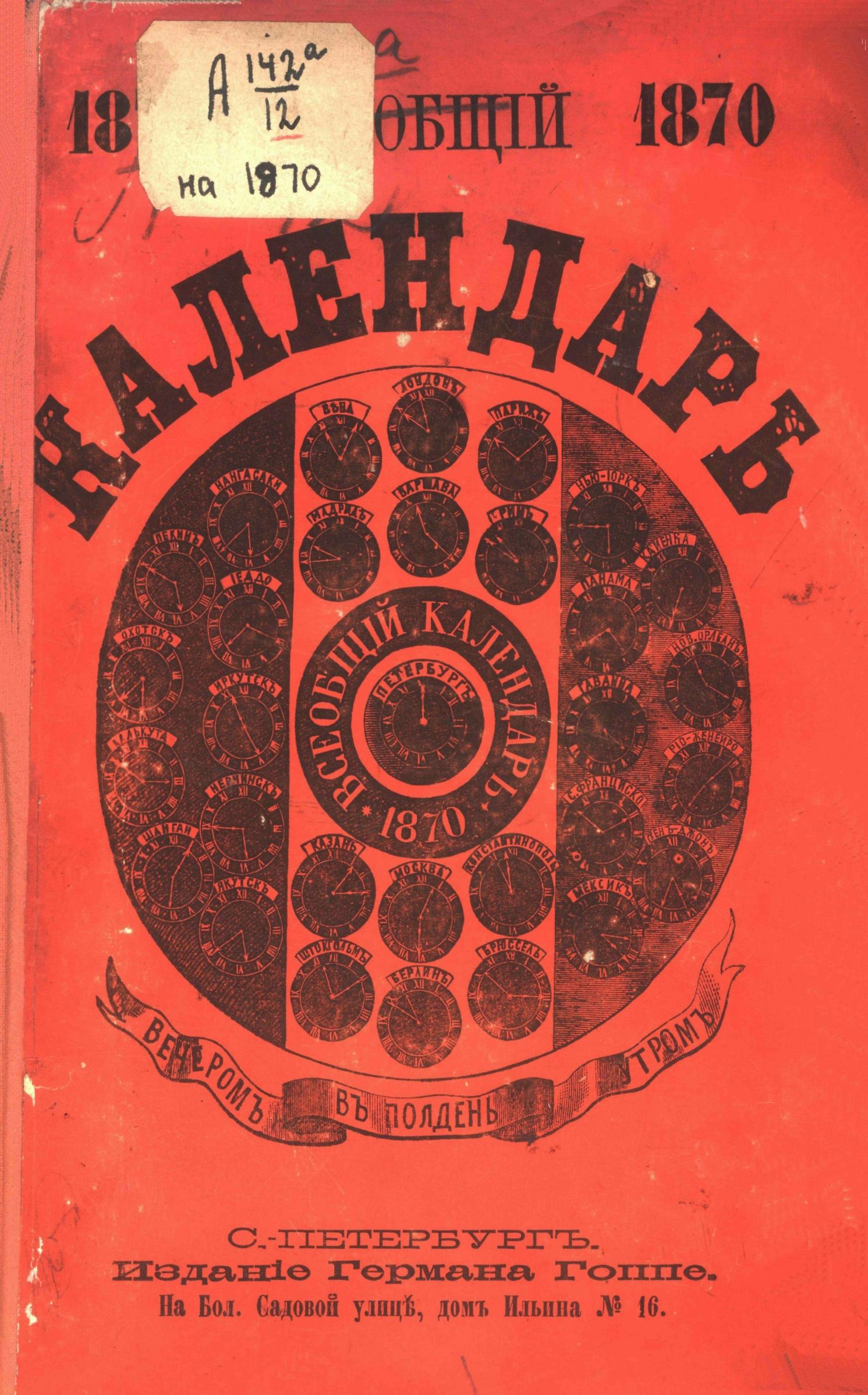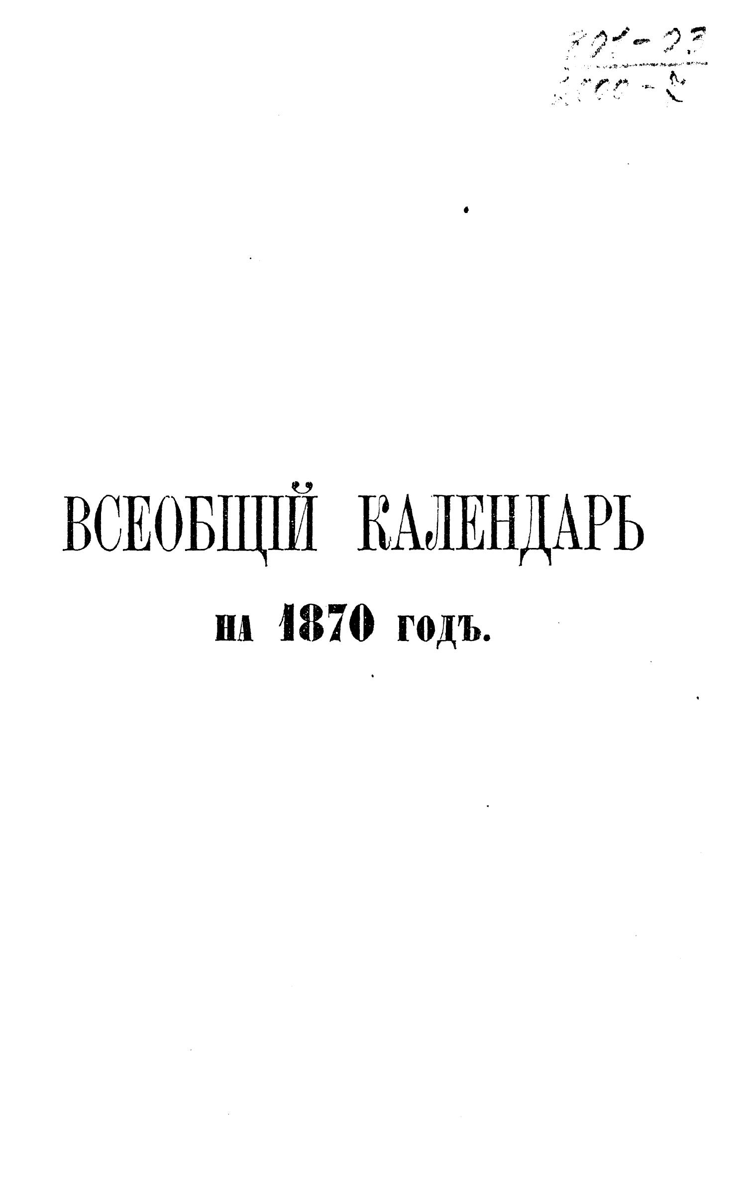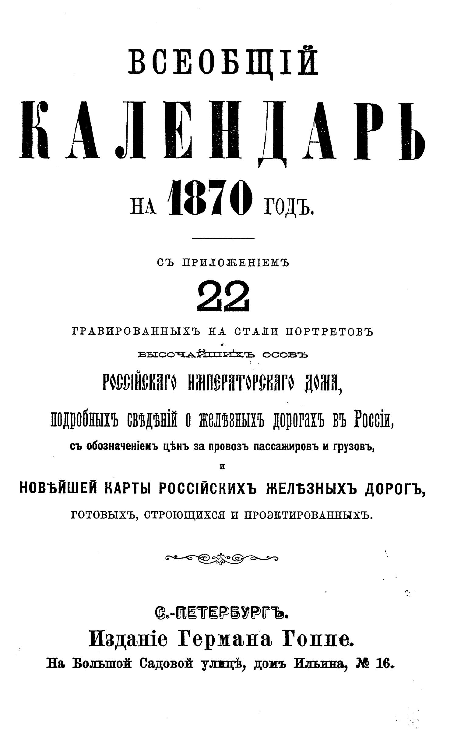 Всеобщий календарь на 1870 г. с прил. подробных сведений о ж/д. в России, с обозначением цен за провоз пассажиров и грузов и новейшей карты росс. ж/д., готовых, строящихся и проектированных