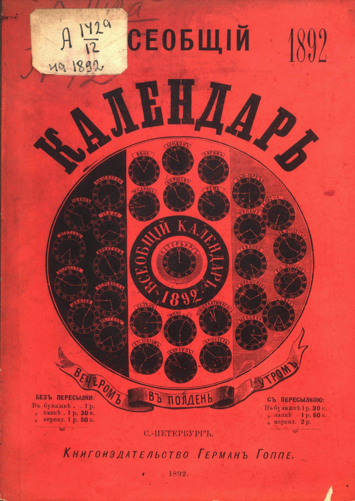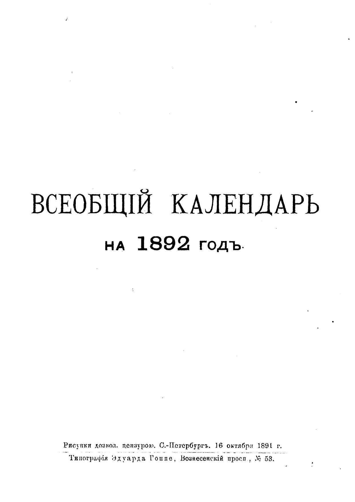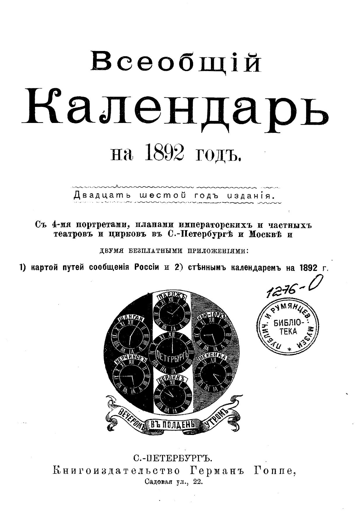 Всеобщий календарь на 1892 г. 26-й г. изд. : с 4 портр., планами Императ. и частных театров и цирков в С.-Петербурге и Москве и 2-мя прил.: 1) картой путей сообщения и 2) стенным календарем