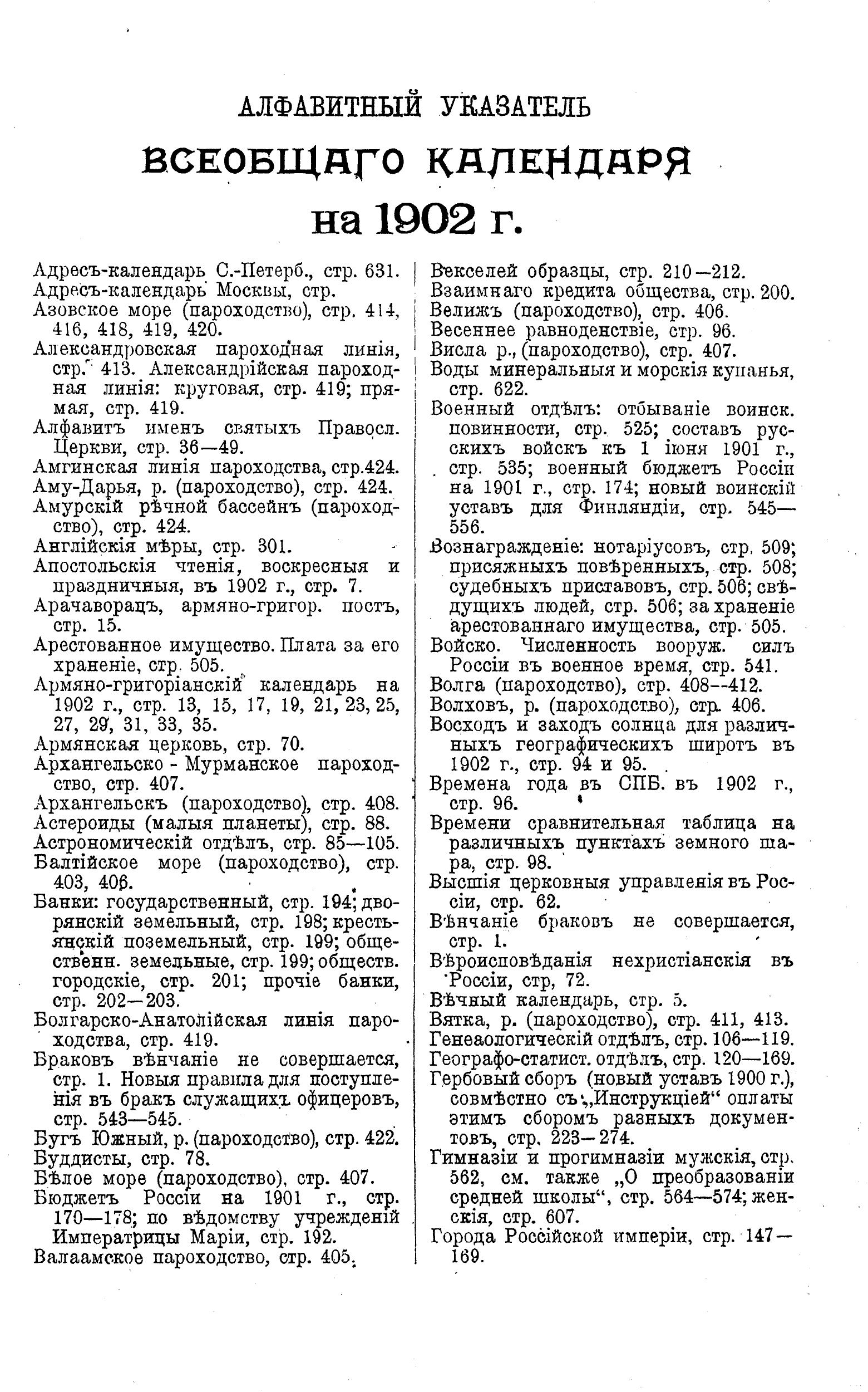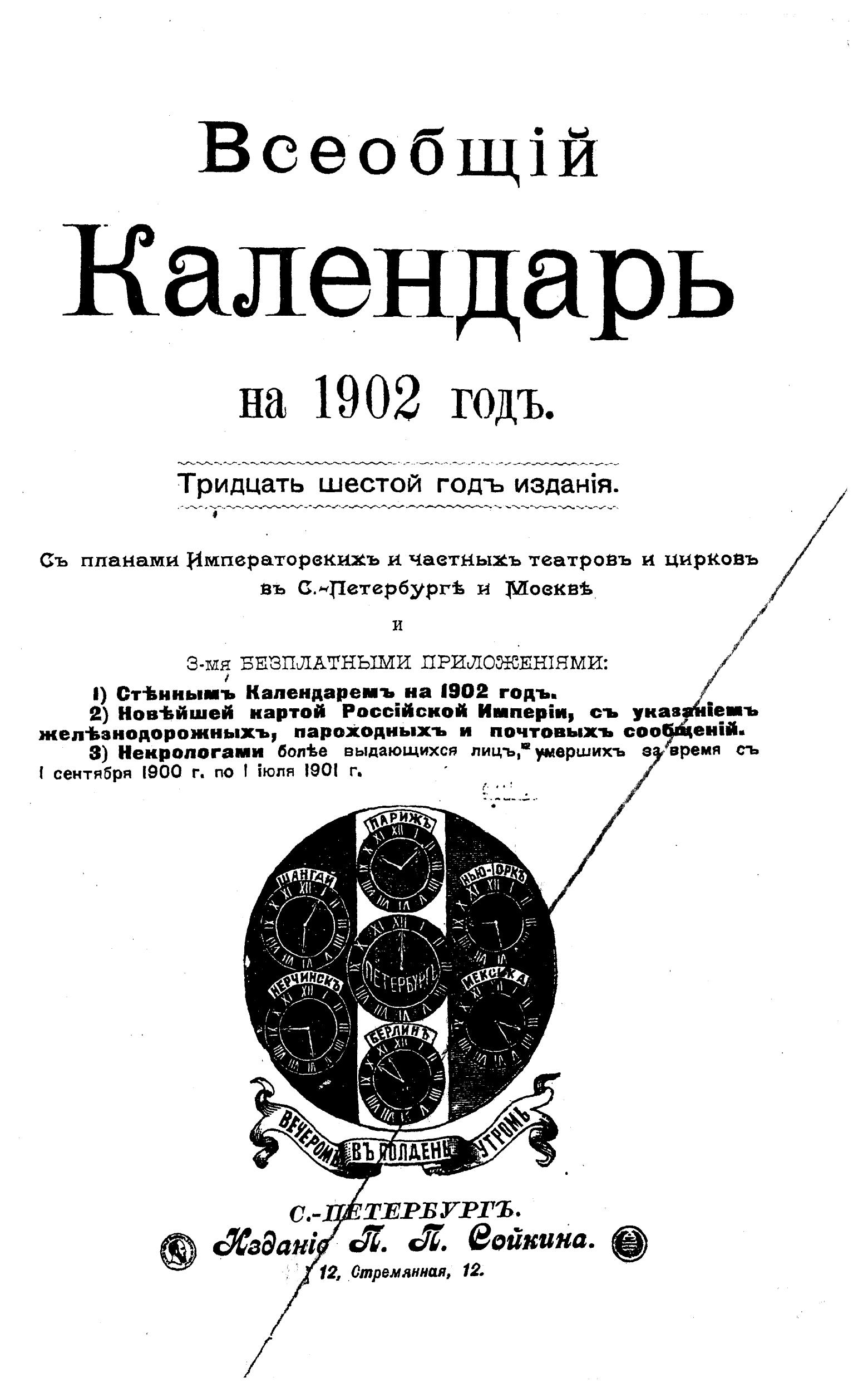 Всеобщий календарь на 1902 г. 36-й г. изд. : с 3-мя прил.: 1) стенным календарем, 2) новейшей картой Рос. империи, с указанием ж.-д. пароходных и почтовых сообщений, 3) некрологами более выдающихся лиц, умерших за время с 1 сент. 1900 г. по 1 июля 1901 г.