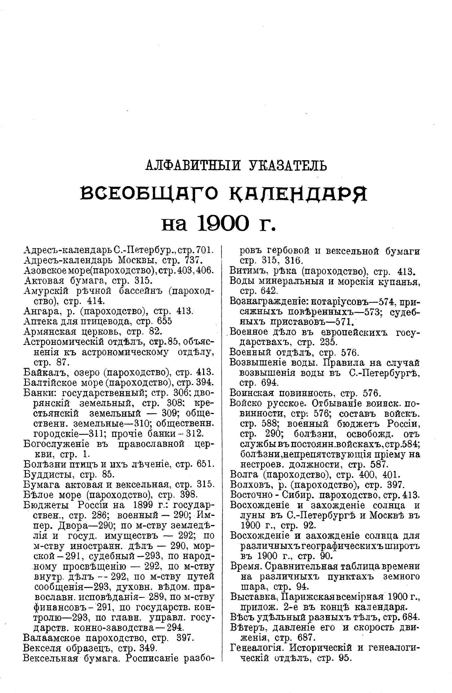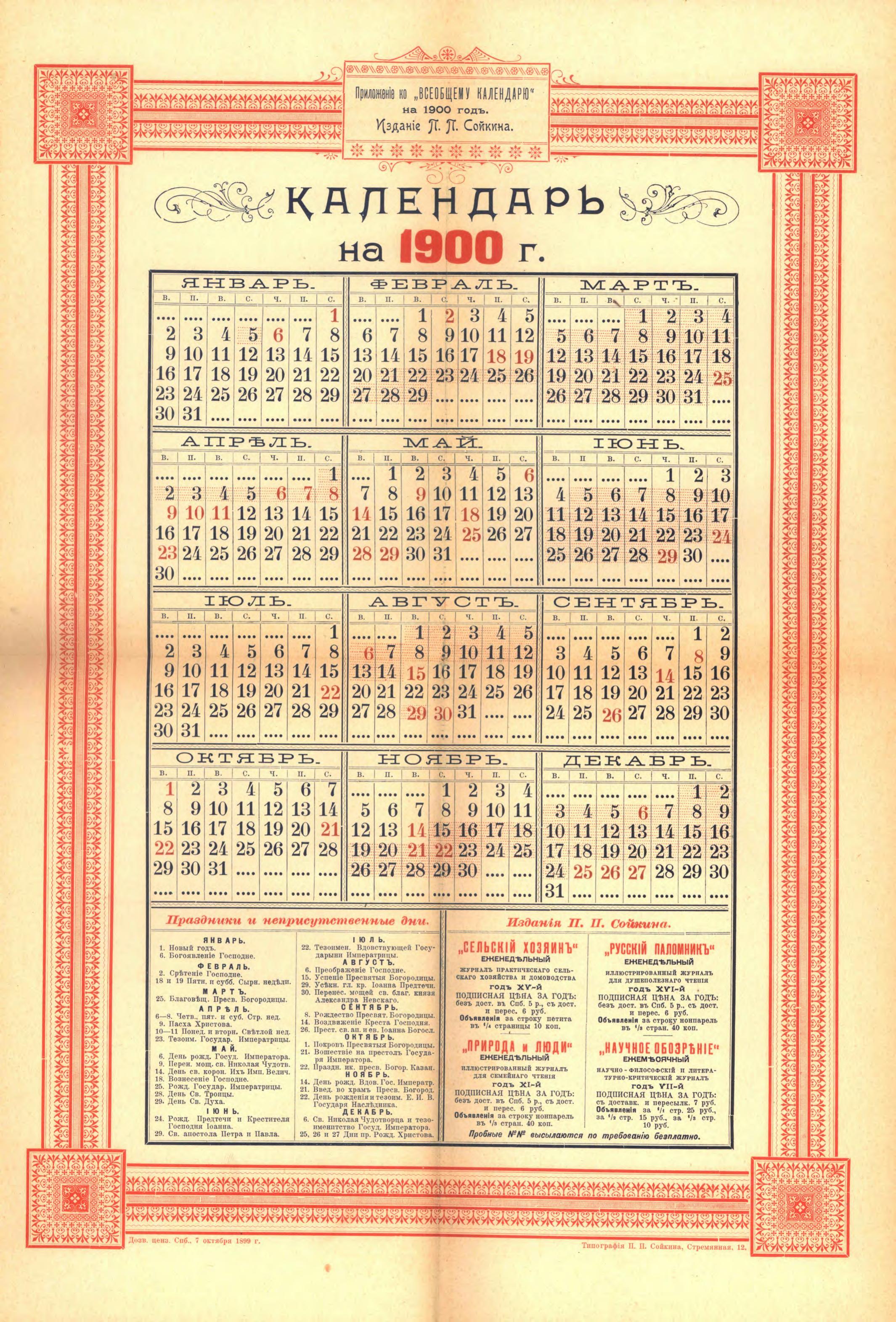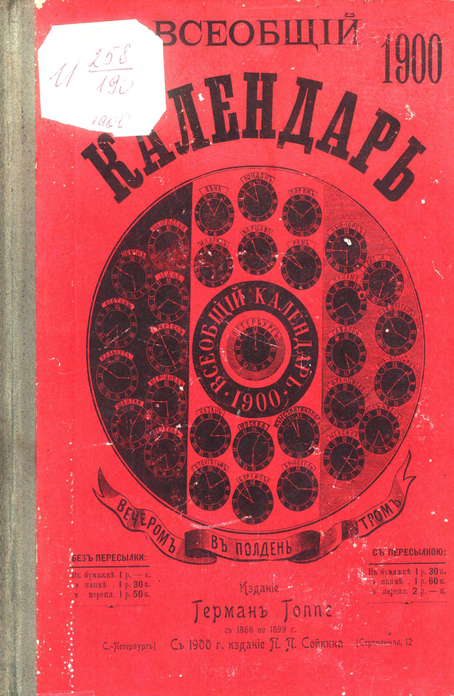 Всеобщий календарь на 1900 г. 34-й г. изд. : с планами Импер. и частных театров и цирков в СПб. и 2-мя прил.: 1) стенного календаря, 2) новейшей карты путей сообщения России