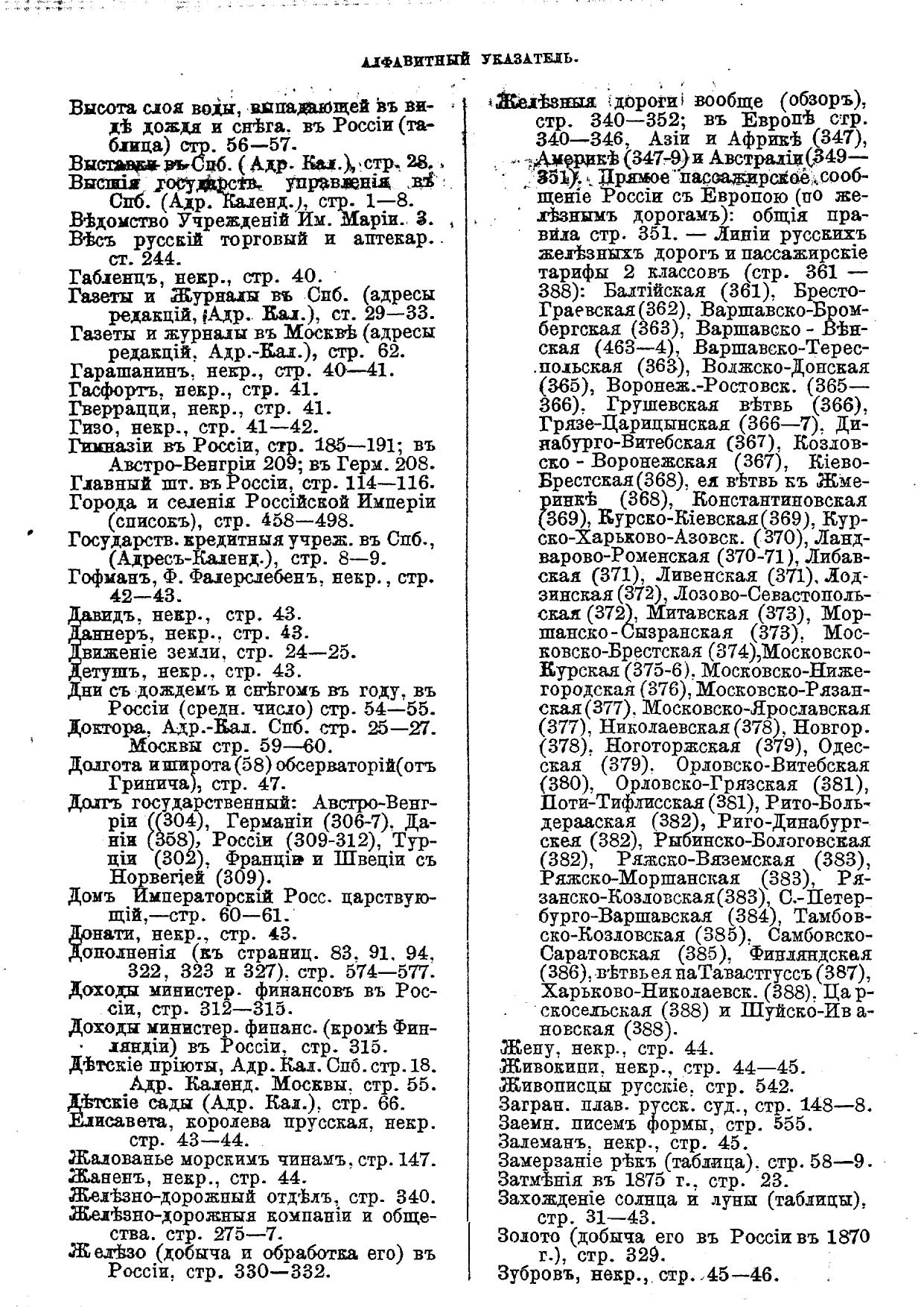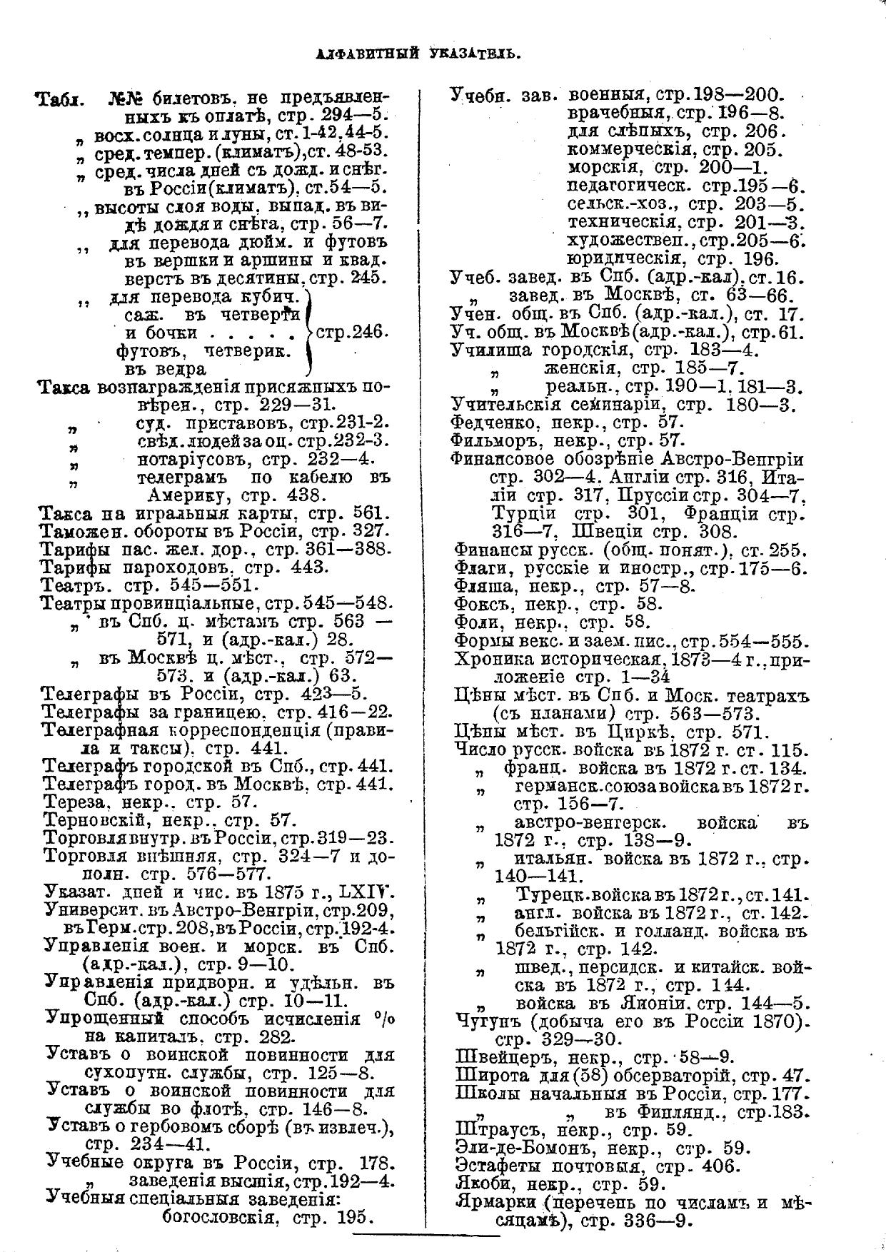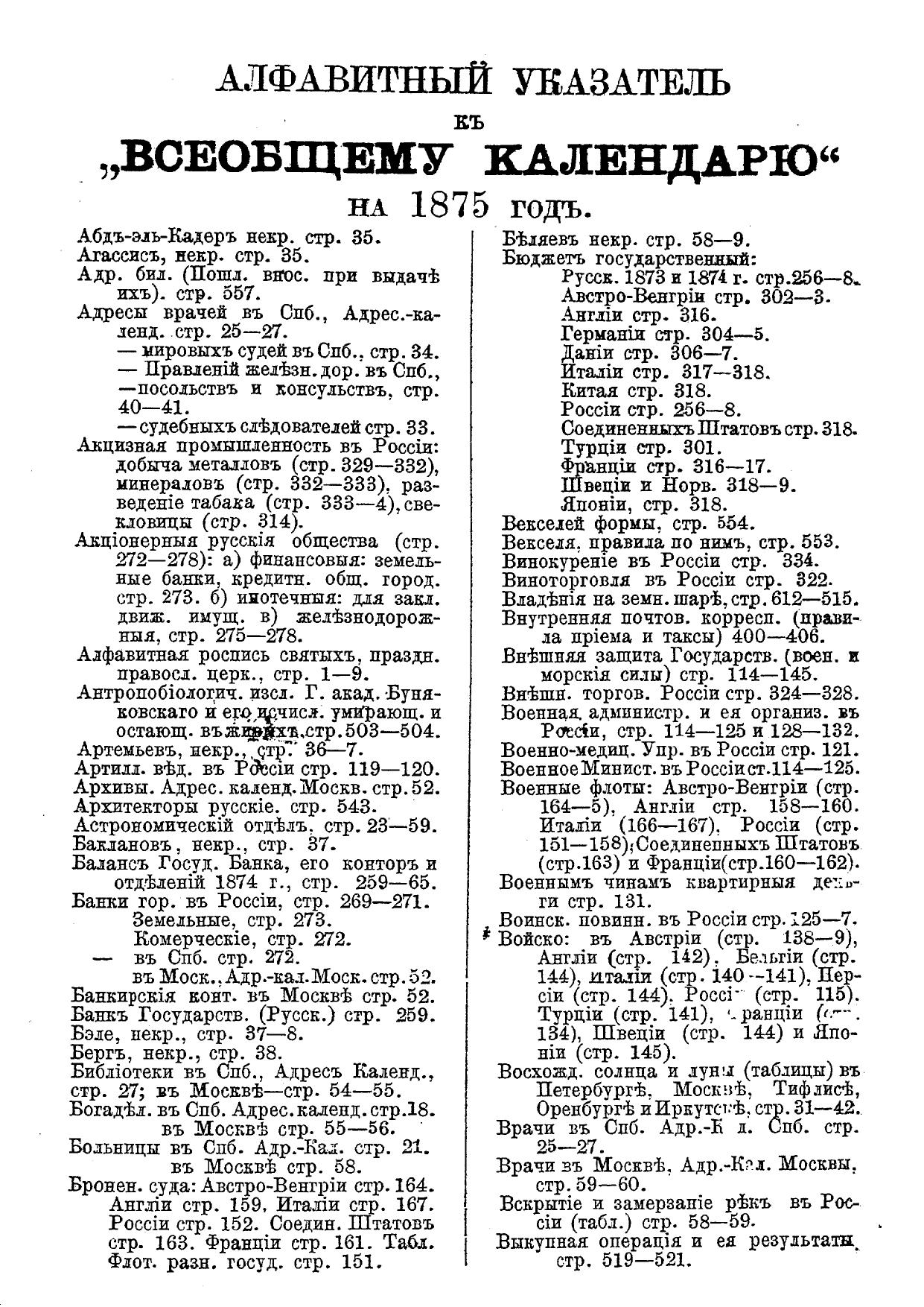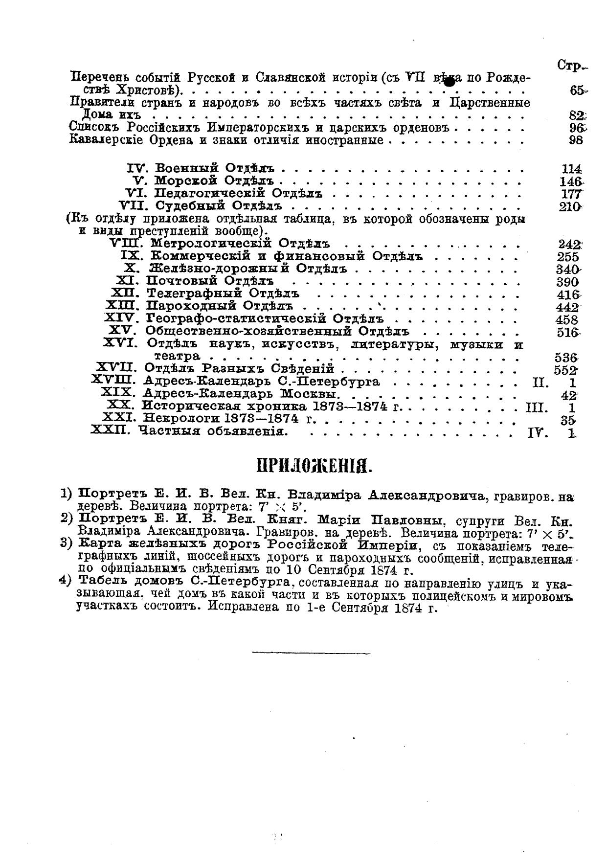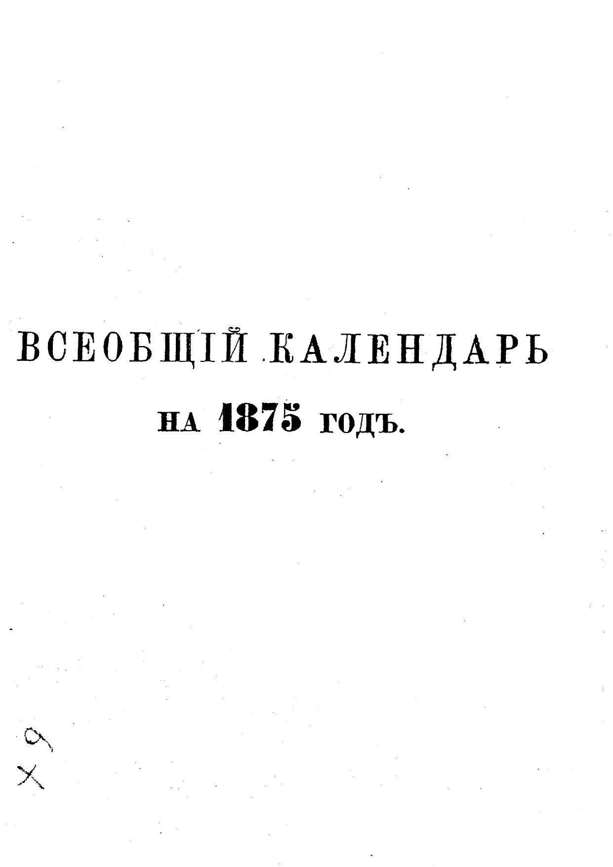 Всеобщий календарь на 1875 г. прил.: 1) портр. Е.И.В. Вел. кн. Владимира Александровича, 2) портр. Е.И.В. Вел. кн. Марии Павловны, 3) карта ж/д., пароход. сообщений и телеграфов Росс. империи, испр. и доп. по 10 сент. 1874 г., 4) табель домов С.-Петербург