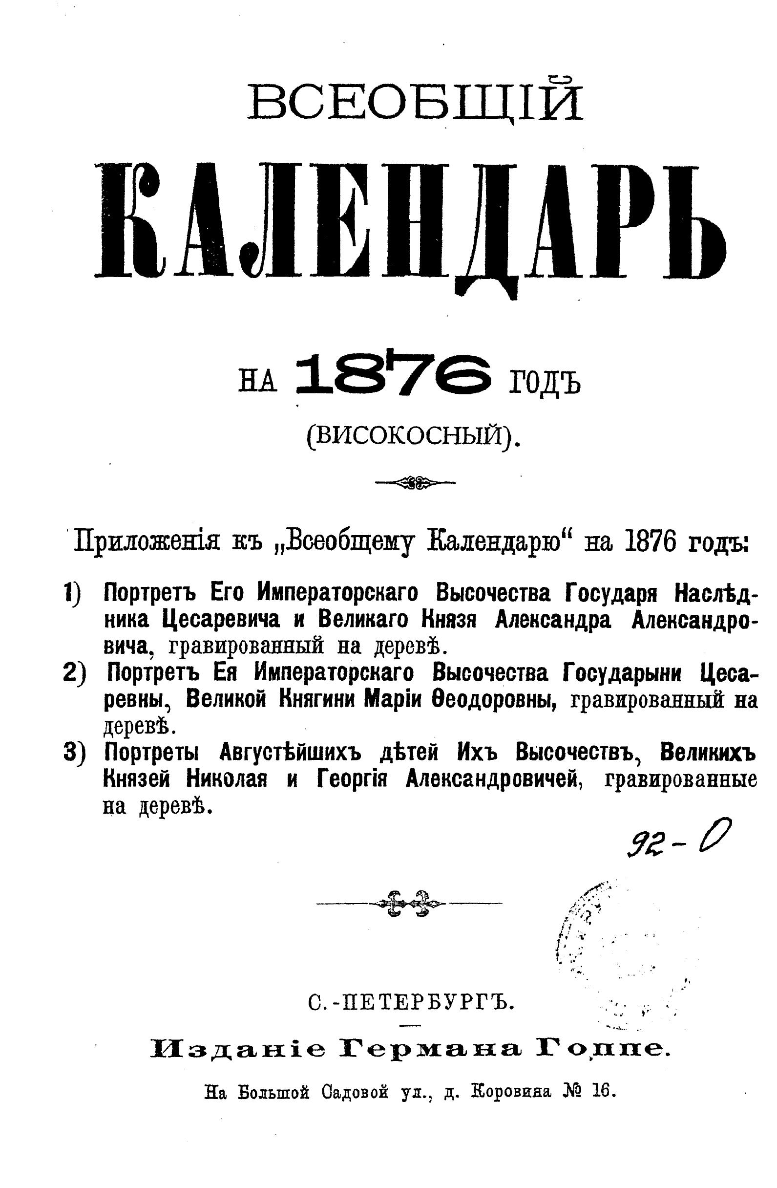 Всеобщий календарь на 1876 г. (високосный)