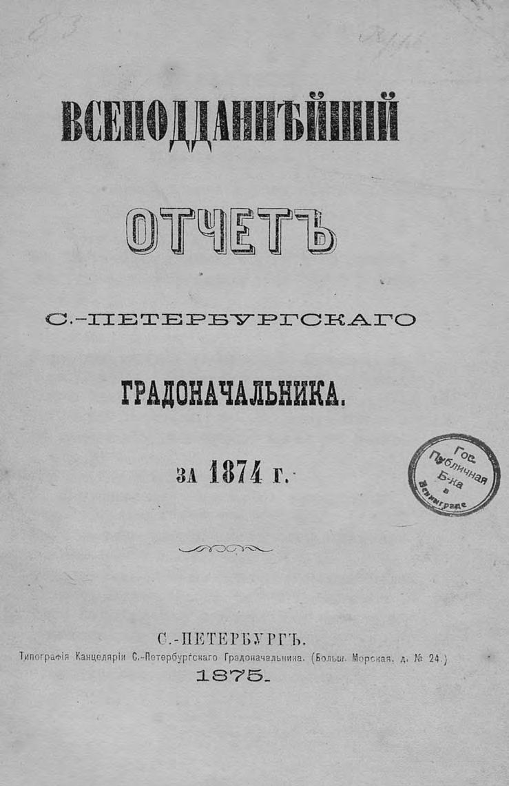 Всеподданнейший отчет С.-Петербургского градоначальника за 1874 г.