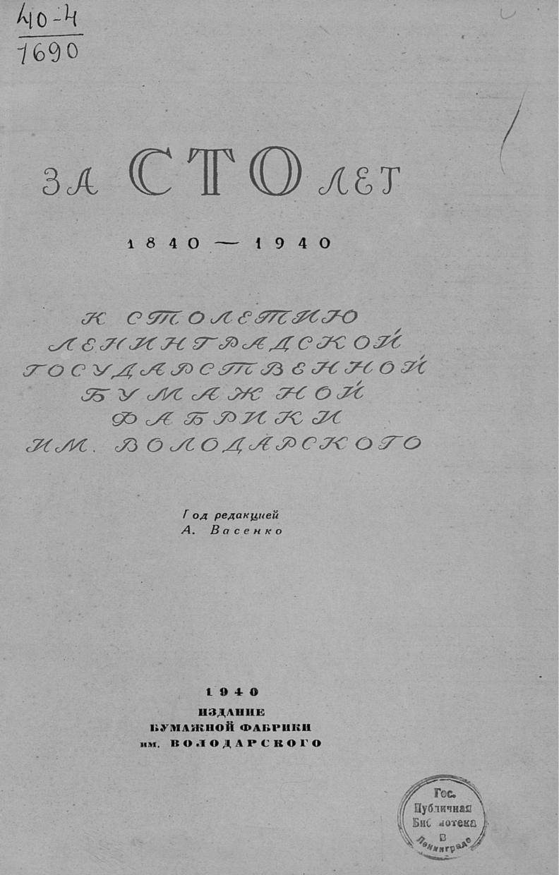 За сто лет, 1840-1940 : к столетию Ленинградской государственной бумажной фабрики им. Володарского