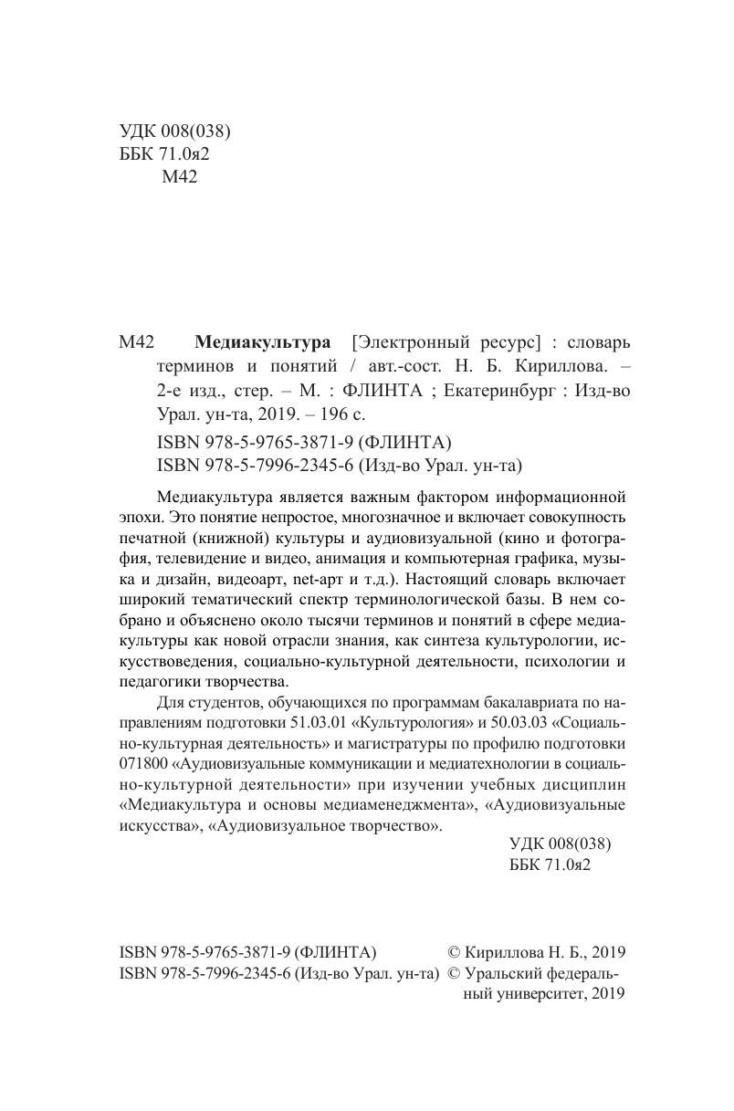 Медиакультура является важным фактором информационной эпохи. Это понятие непростое, многозначное и включает совокупность печатной (книжной) культуры и аудиовизуальной (кино и фотография, телевидение и видео, анимация и компьютерная графика, музыка и дизайн, видеоарт, net-арт и т.д.). Настоящий словарь включает широкий тематический спектр терминологической базы. В нем собрано и объяснено около тысячи терминов и понятий в сфере медиакультуры как новой отрасли знания, как синтеза культурологии, искусствоведения, социально-культурной деятельности, психологии и педагогики творчества.